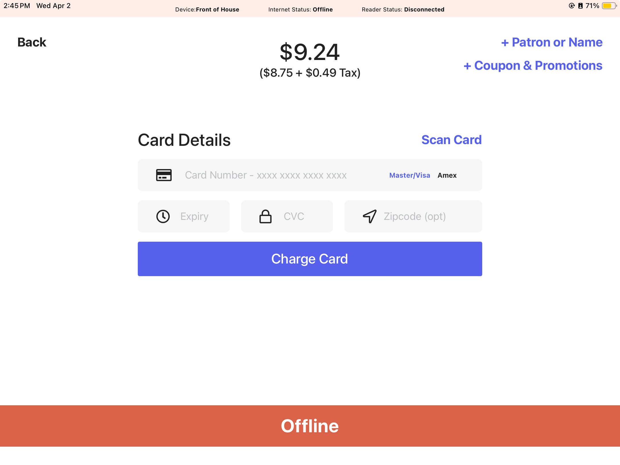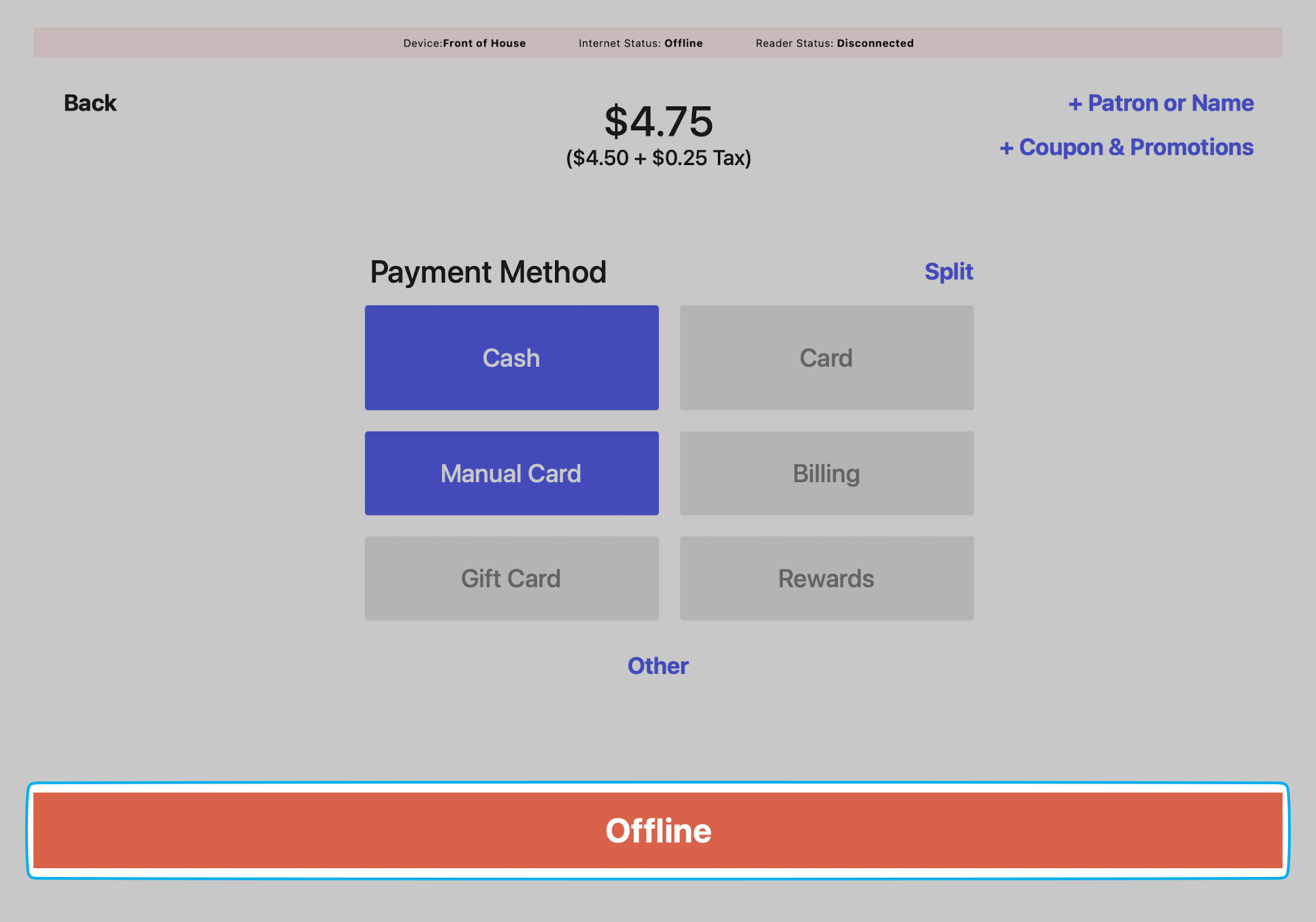 If manually entered card information is incorrect, the transaction won’t process when back online and the sale will be lost. Please double-check the information inputted!