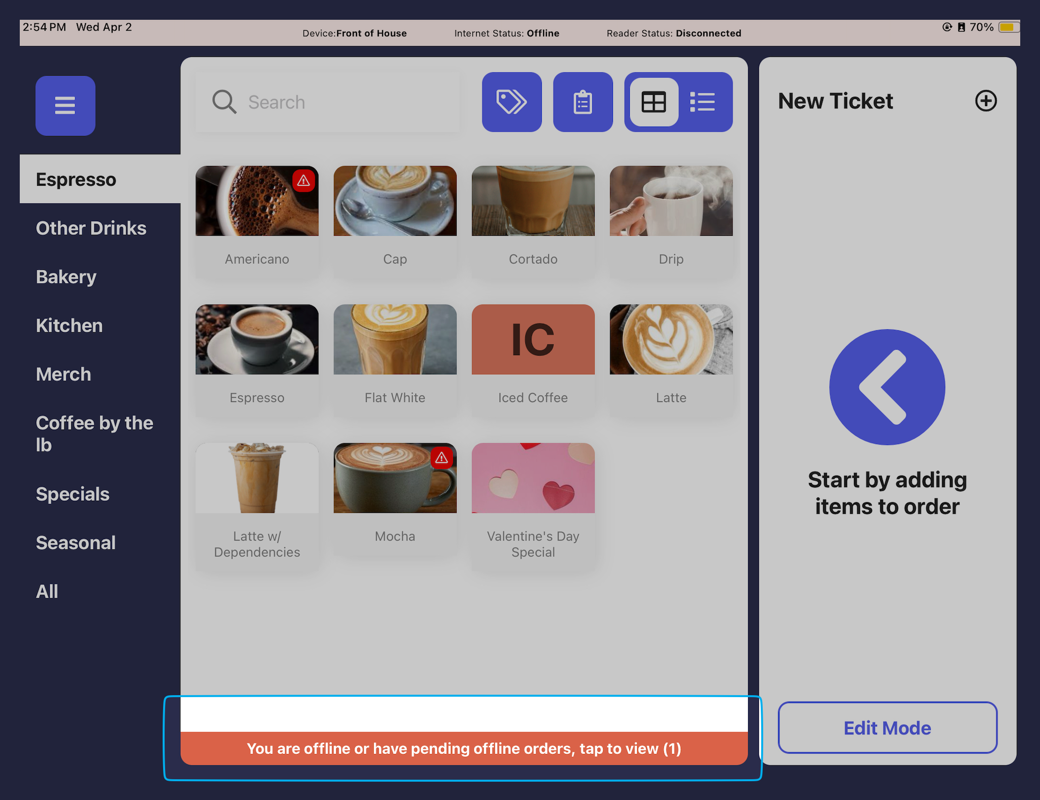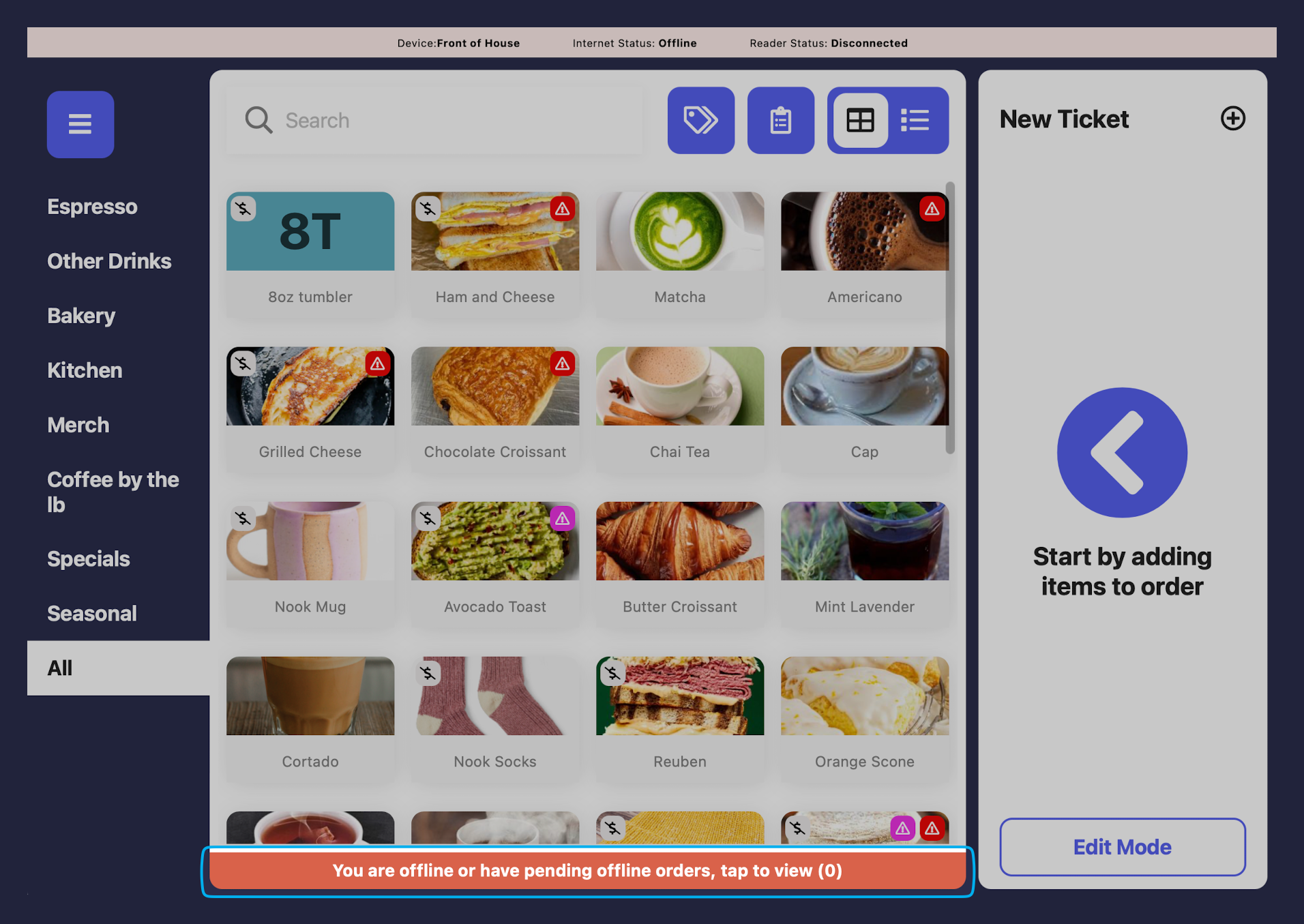 Press the red banner at the bottom that reads “You are offline or have pending offline orders, tap to view banner at the bottom of your screen.”