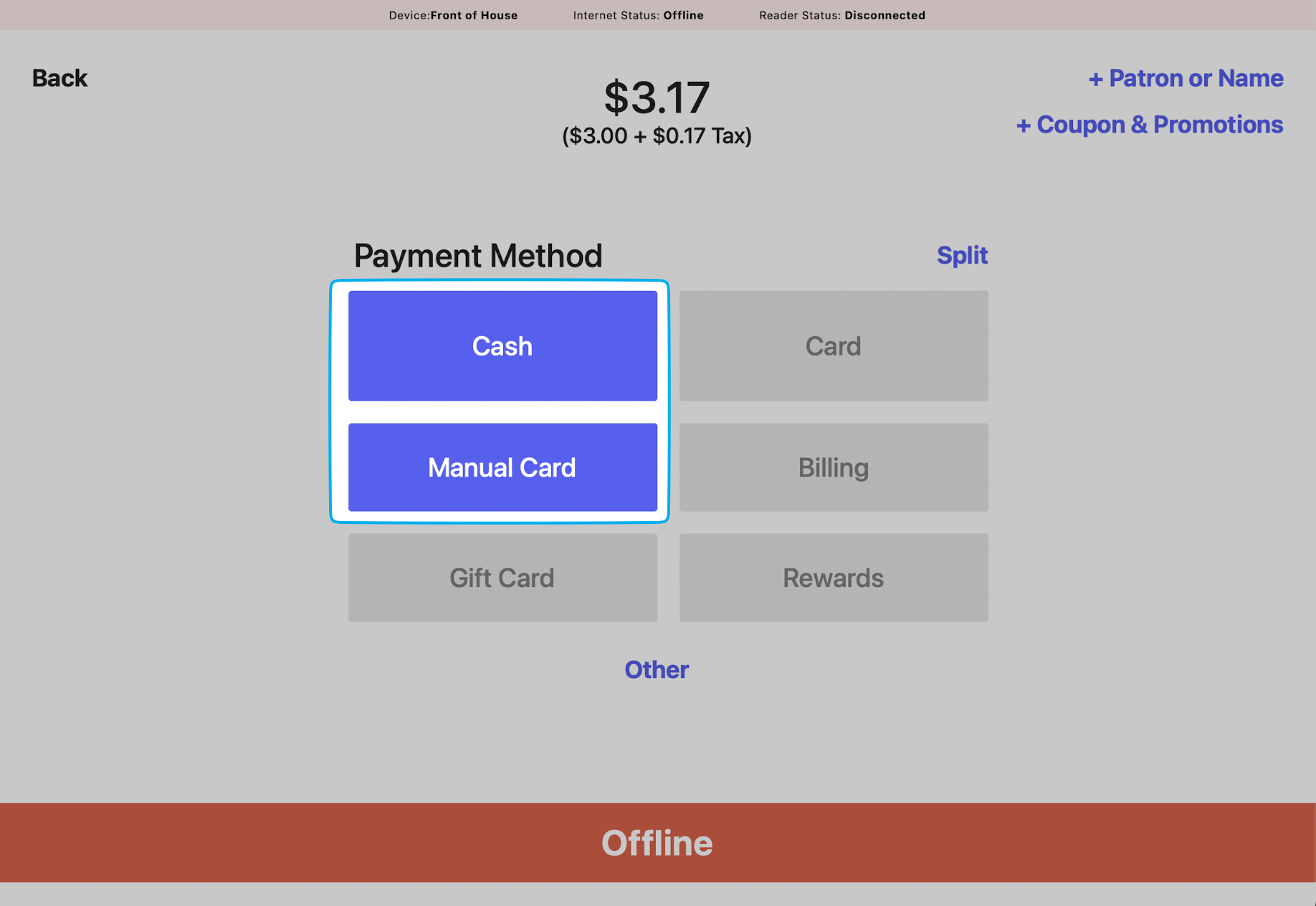 Once on the payment methods screen, only cash and manual card payments will be available for use