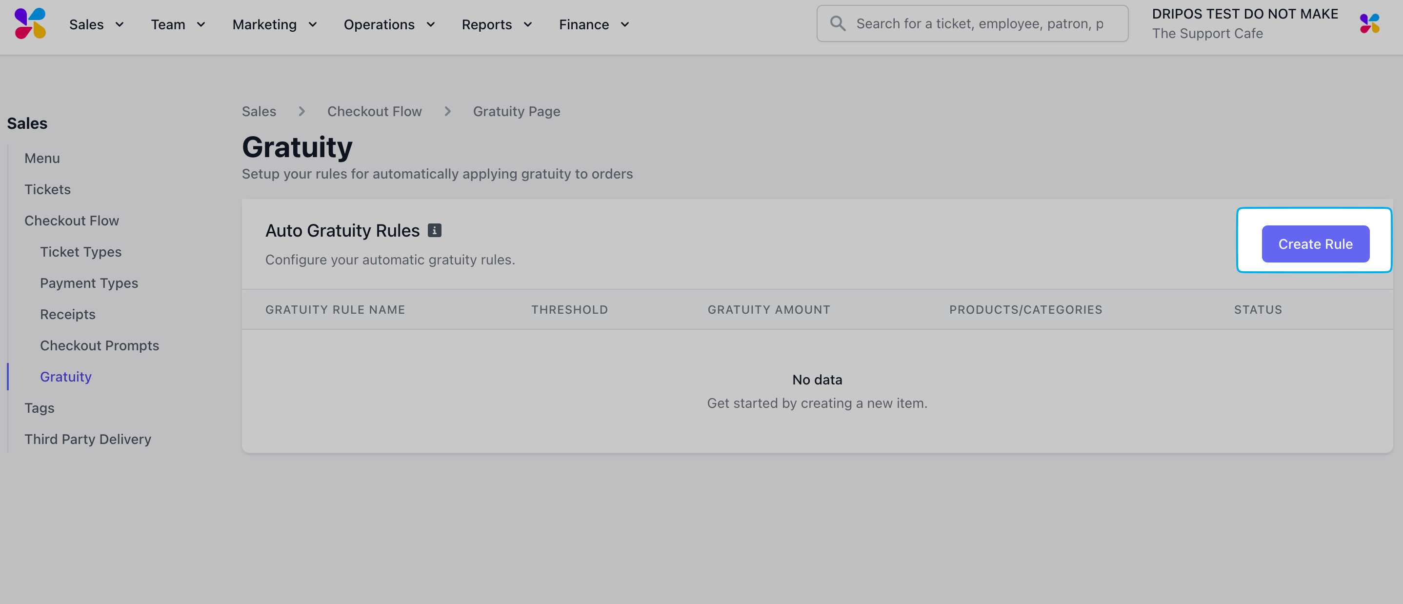 To disable an auto gratuity rule, click View into the rule page > Actions > Disable Rule
