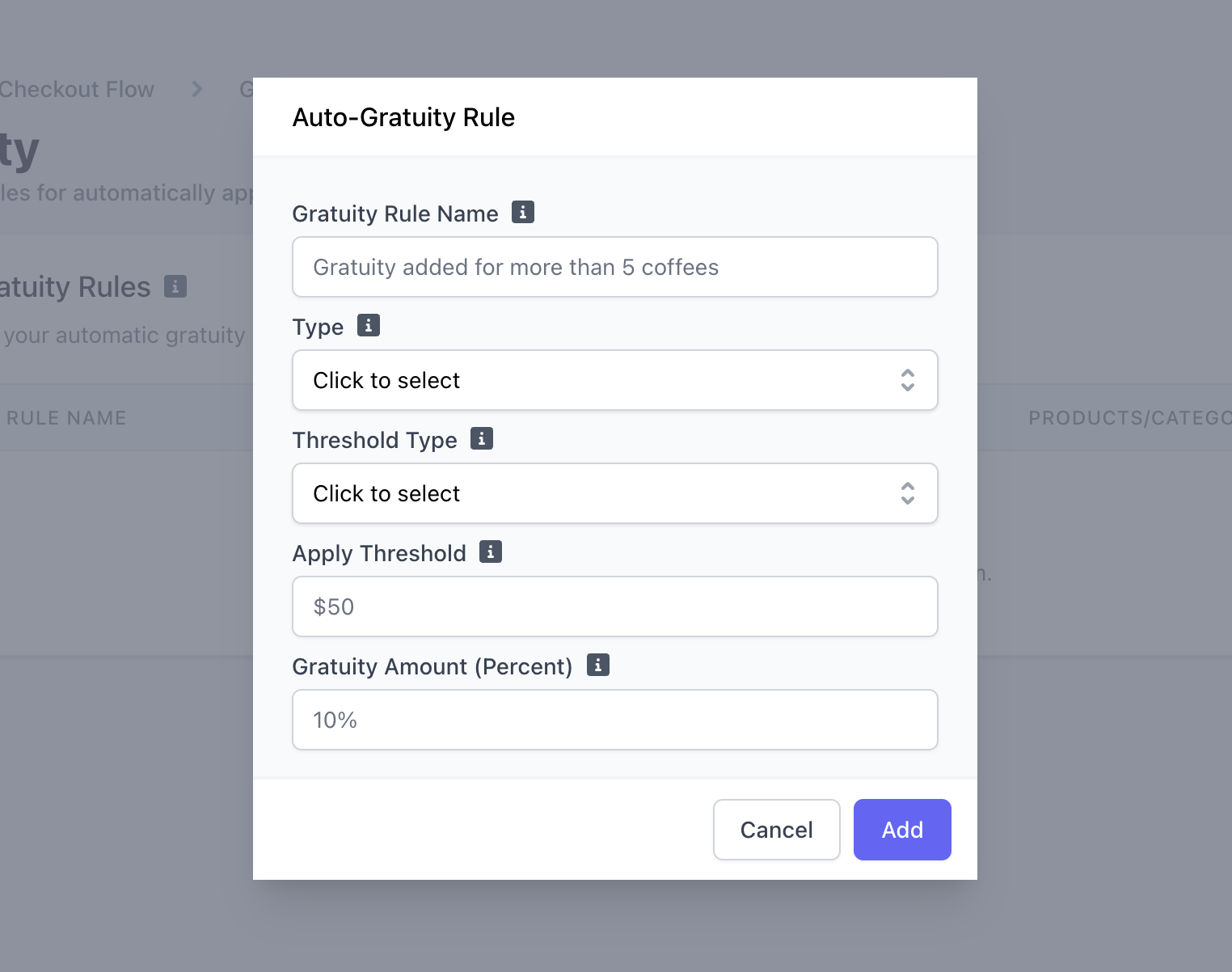 On the Web Dashboard, click Sales > Checkout Flow > Gratuity