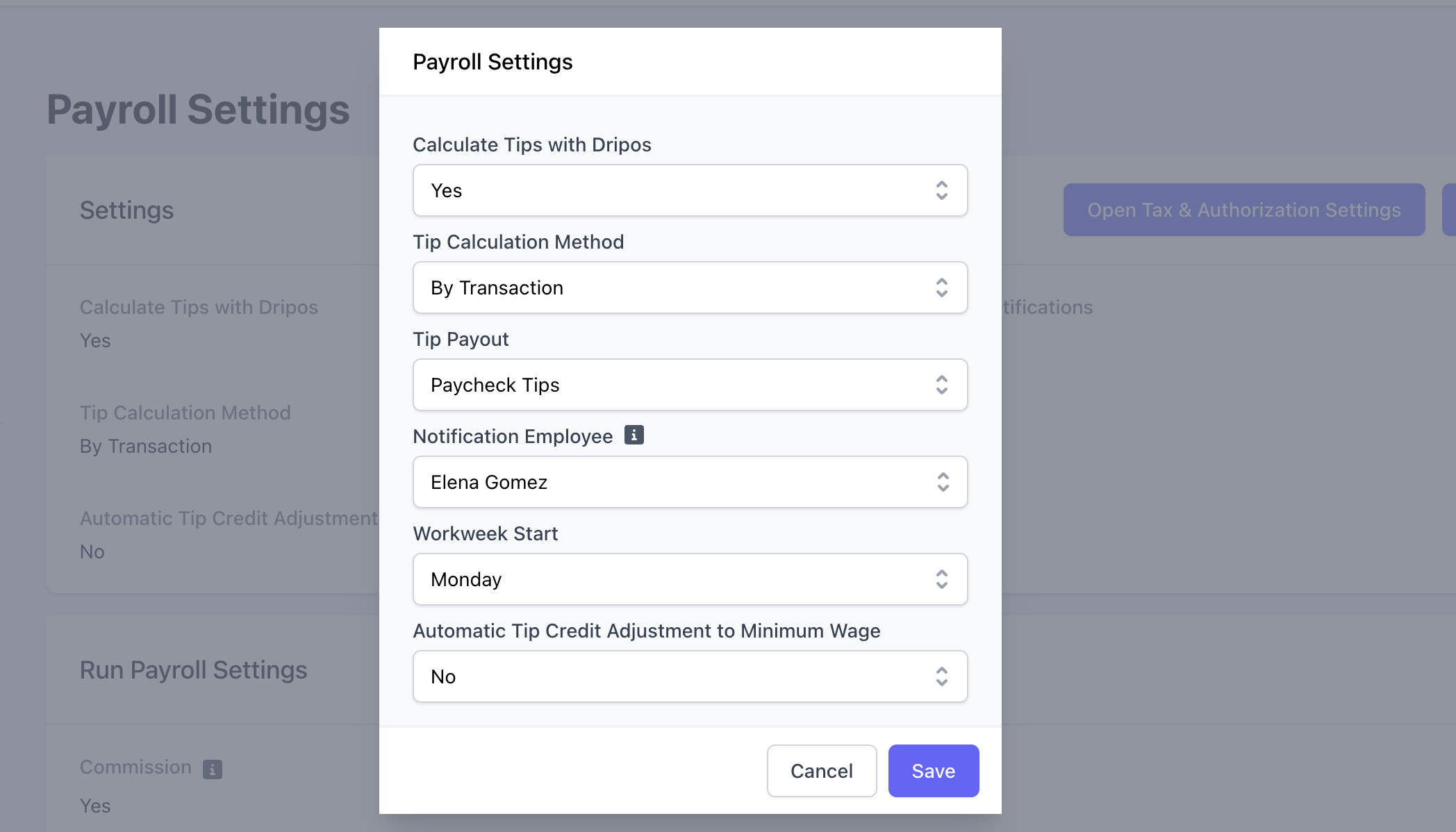 If your shop uses Dripos payroll and cash tip payouts, you can set your payroll settings to automatically report these payouts for tax purposes.For this specific workflow, turn Calculate Tips with Dripos to Yes. The Tip Calculation Method must be By Transaction, with Tip Payout set to Cash Tips. Learn more about payroll settings here.