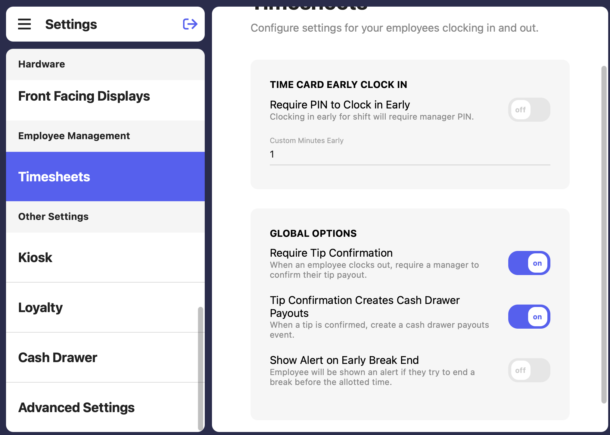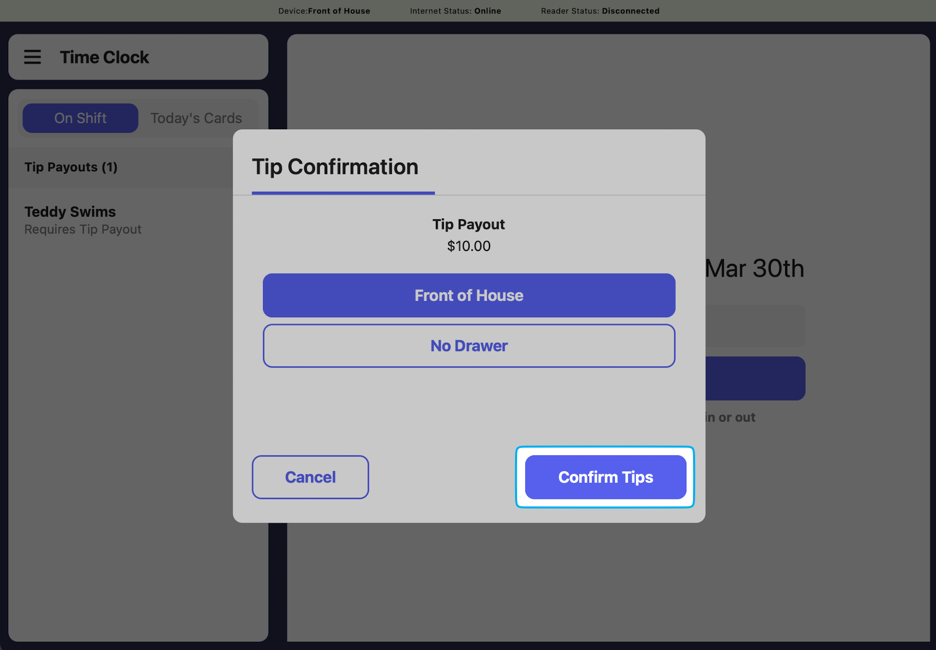 - Require Tip Confirmation: Upon clock out, employees are notified of how much in tips they are owed from that shift.