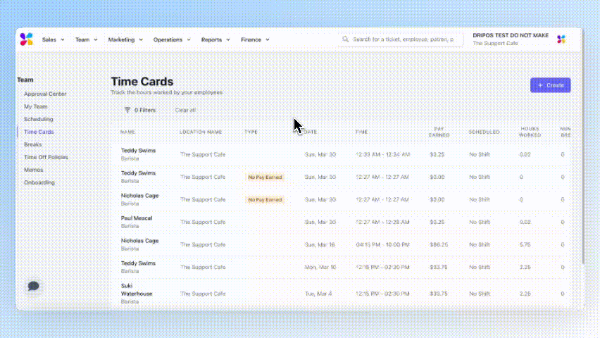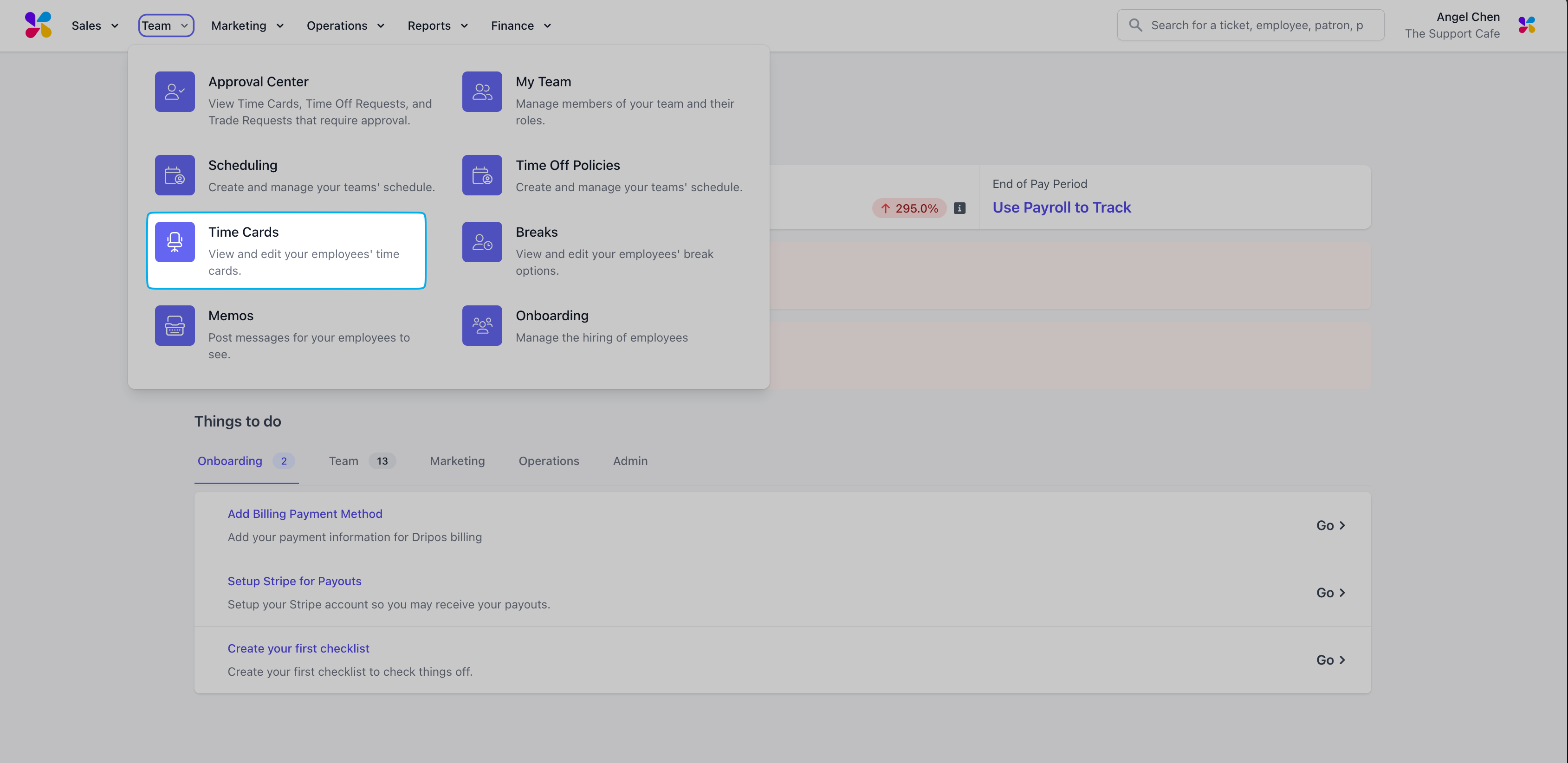 Log in to the Web Dashboard and navigate to Team > Time Cards