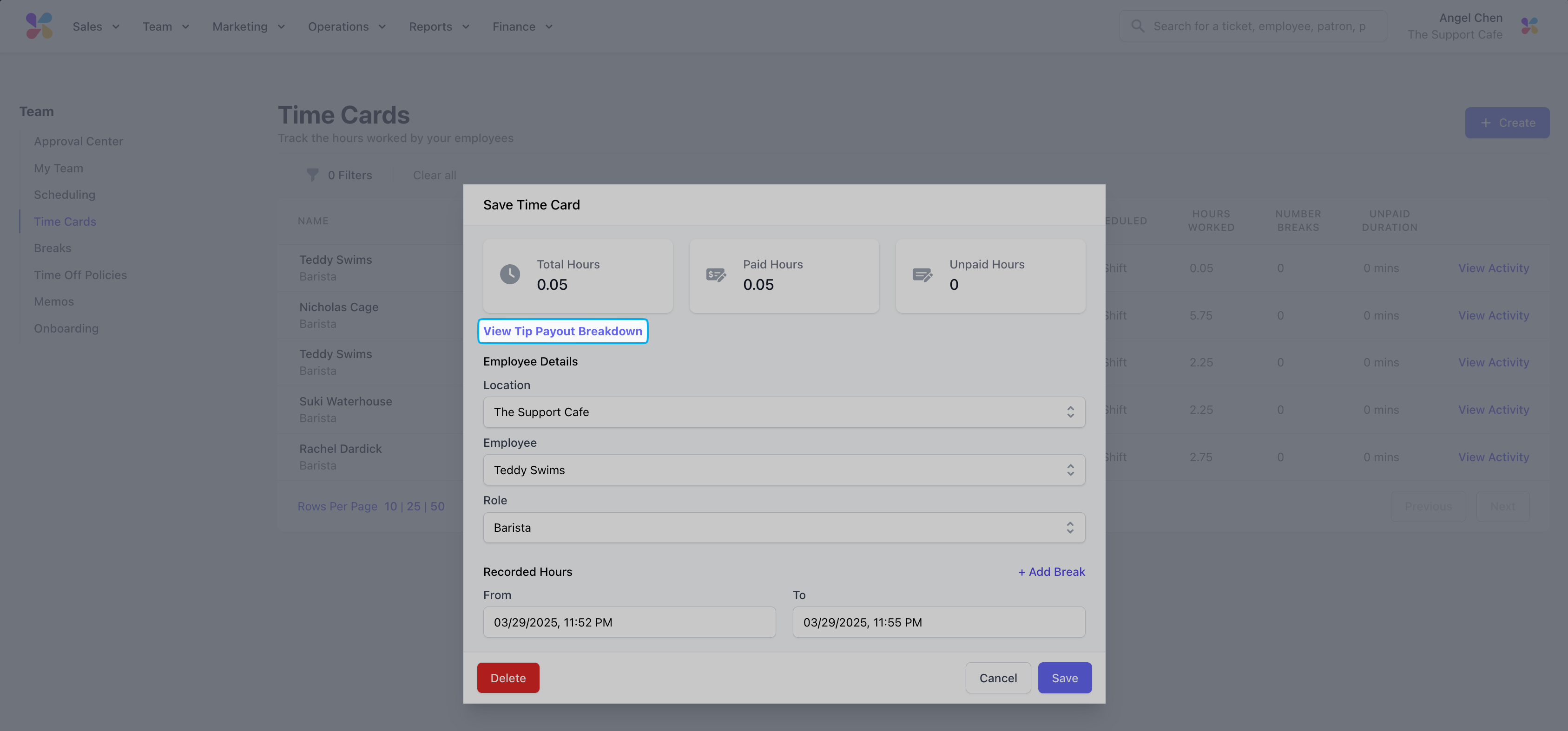 - Dripos accounts for the retroactively created time card and recalculates the tips owed to each employee on that shift.