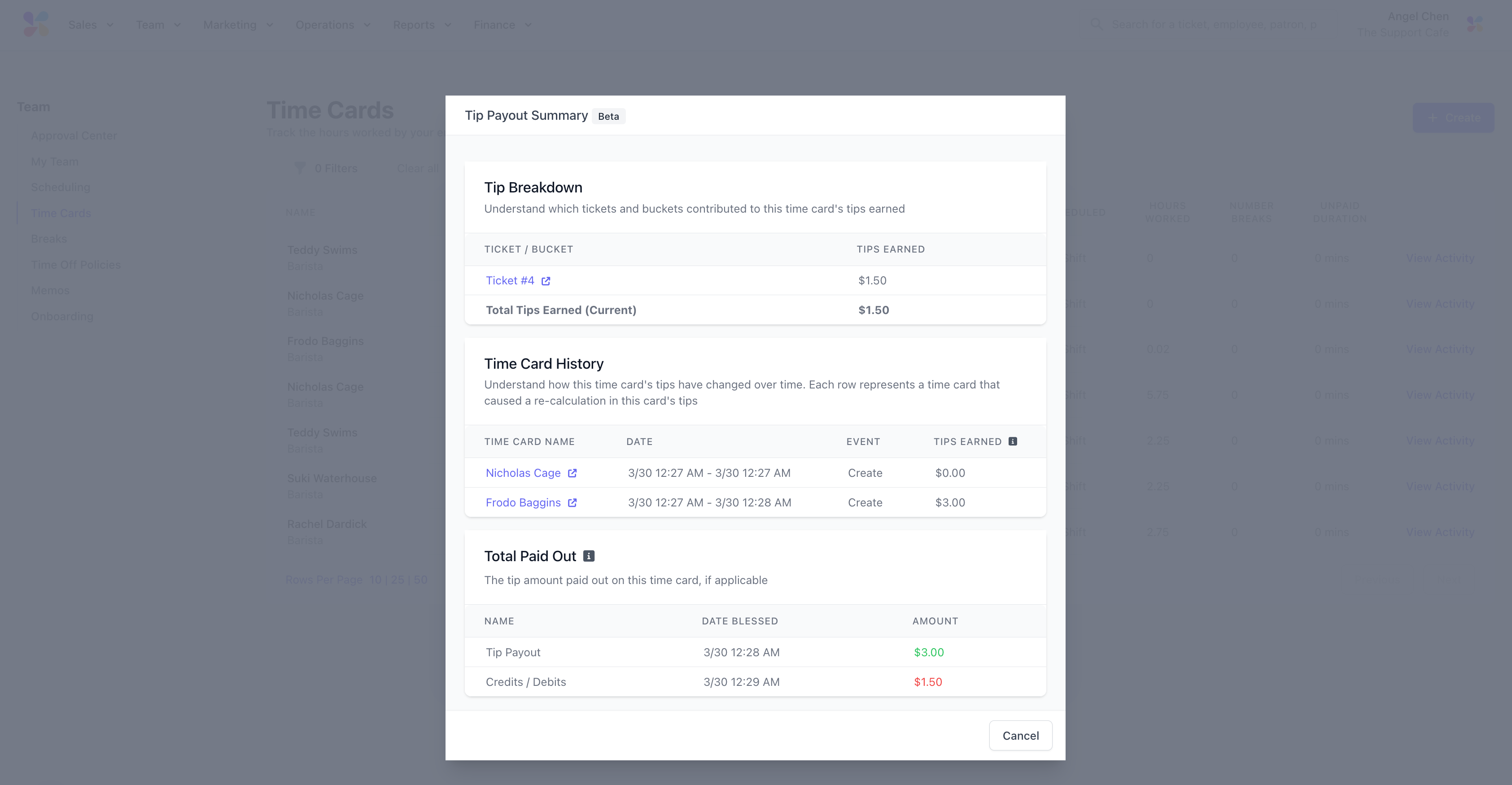 - Total Paid Out: Summary of tip amounts paid out and any pending credits or debits