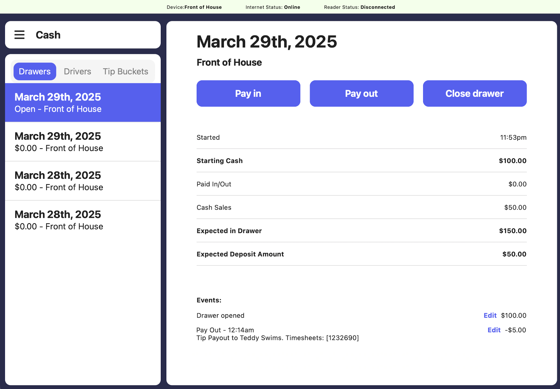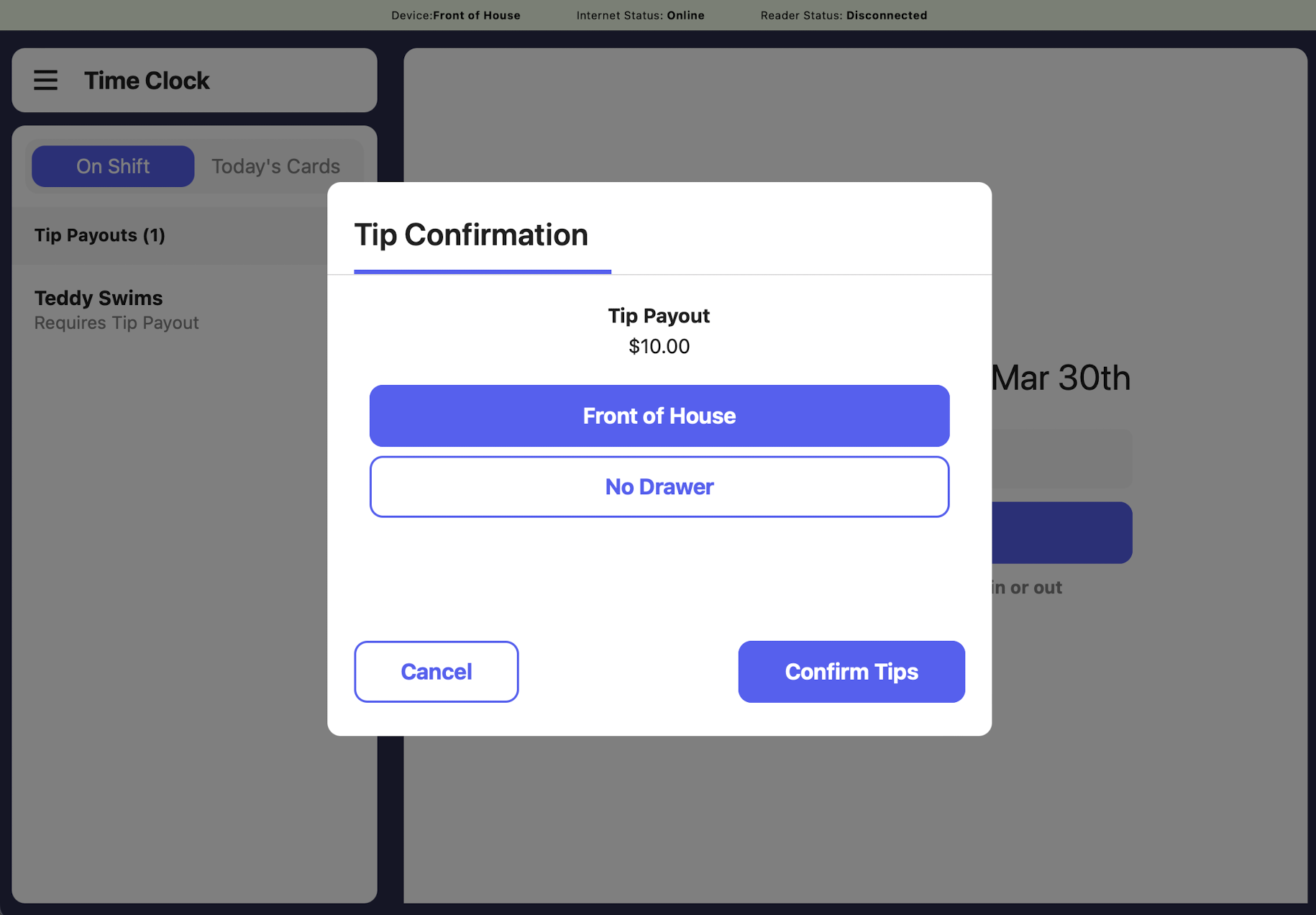 - Tip Confirmation Creates Cash Drawer Payout: When an employee confirms the tips received at the end of a shift, a payout is automatically recorded to balance out the open cash drawer.