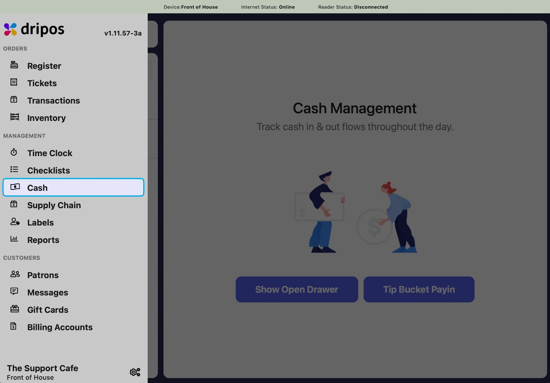 On the Point of Sale, press the tribar (≡) at the top left of the screen and navigate to the Cash tab