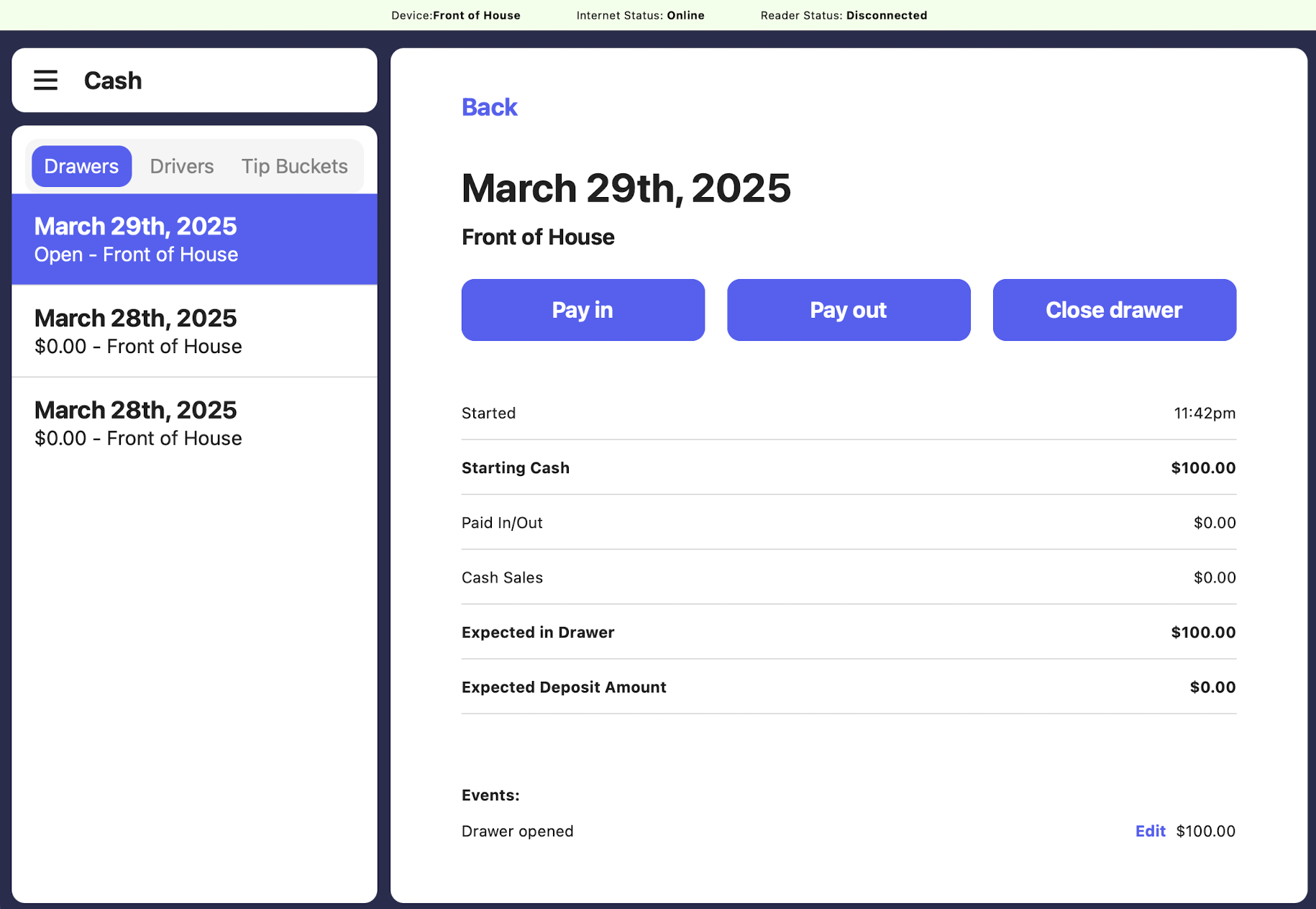 Confirm there is an Open drawer for the day to ensure all cash flow is properly tracked