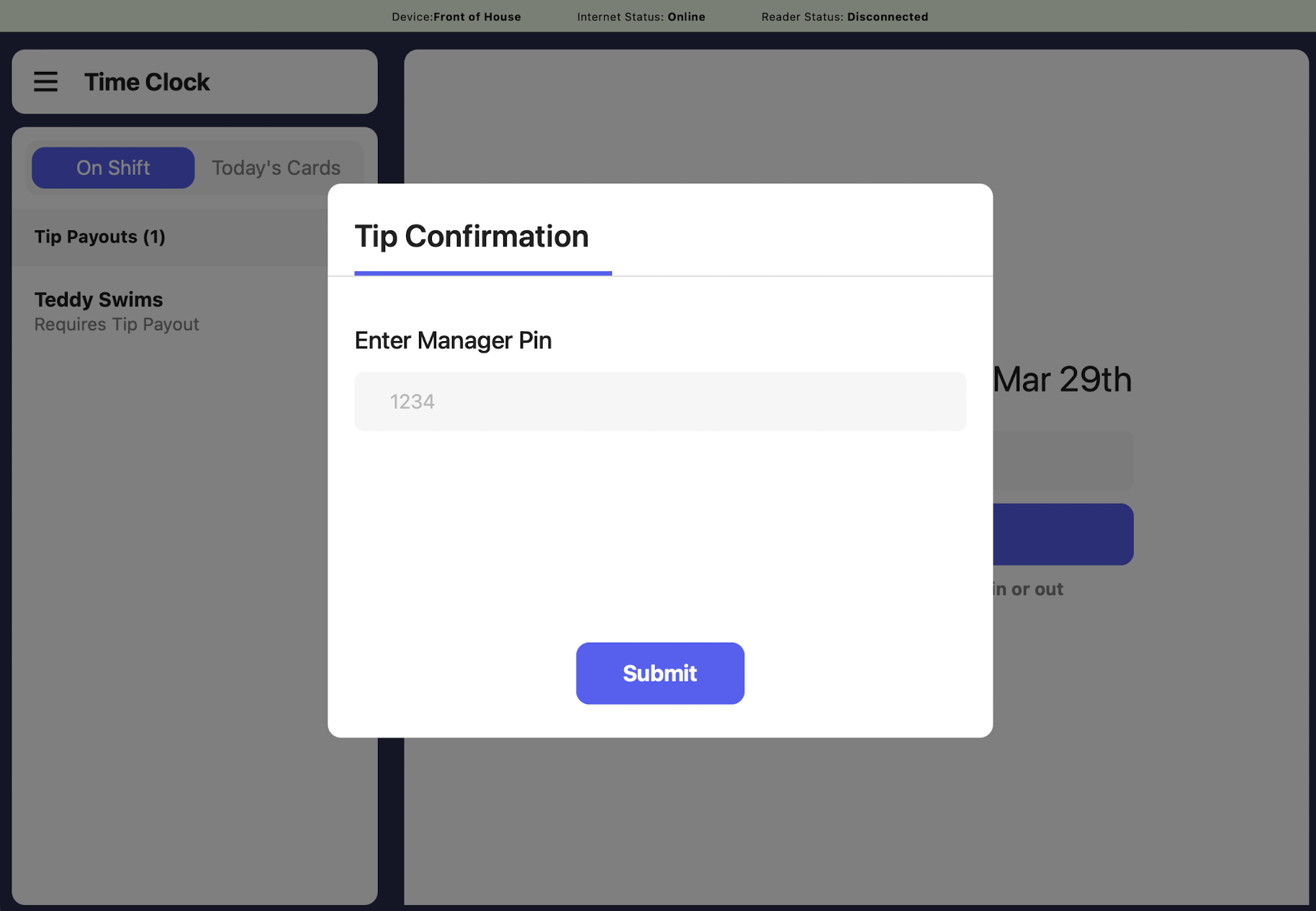 Click on the time card requiring a tip payout to view the amount & input the Manager Pin