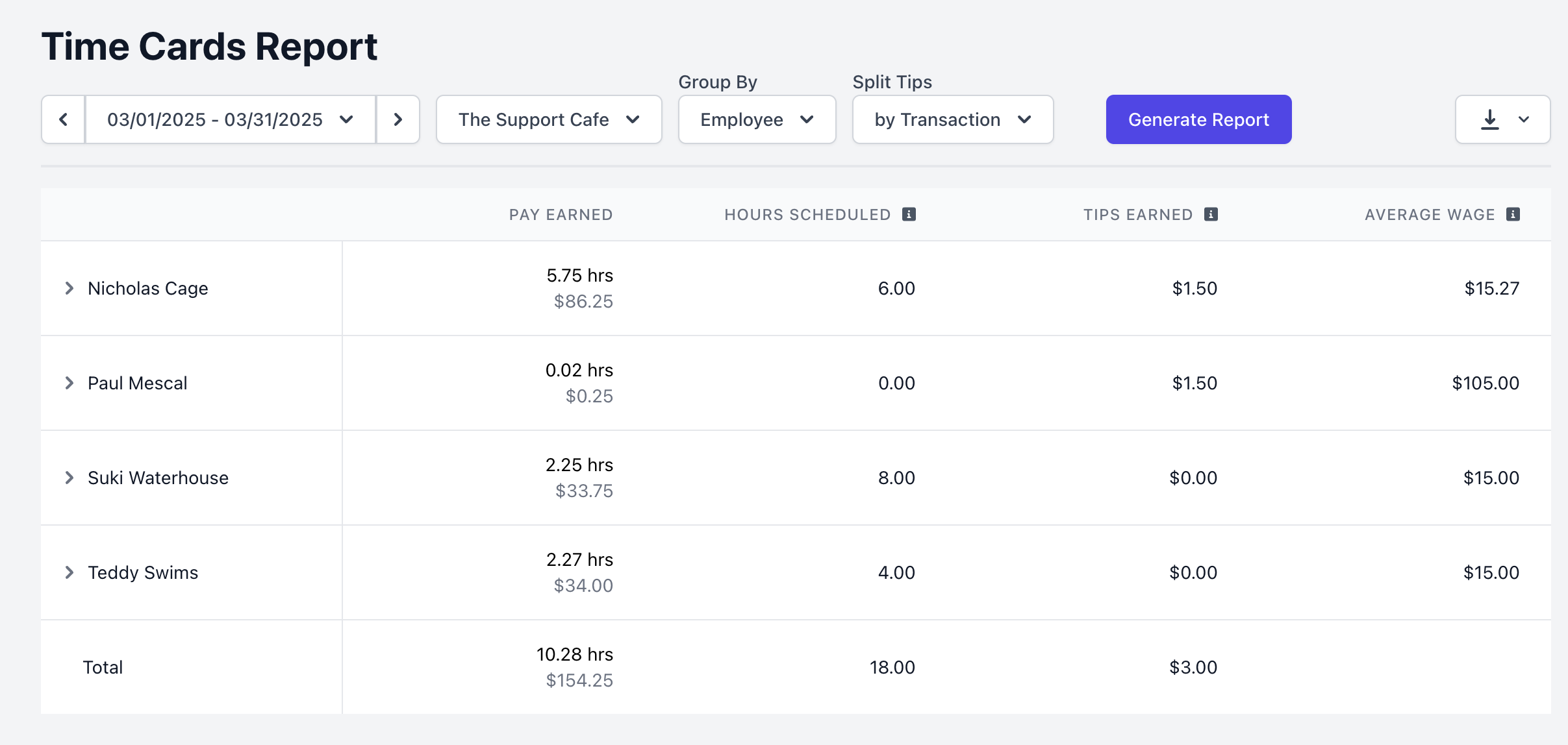 Use the Time Cards Report to review and analyze all tips collected by employees within a designated time period.Time Cards Report