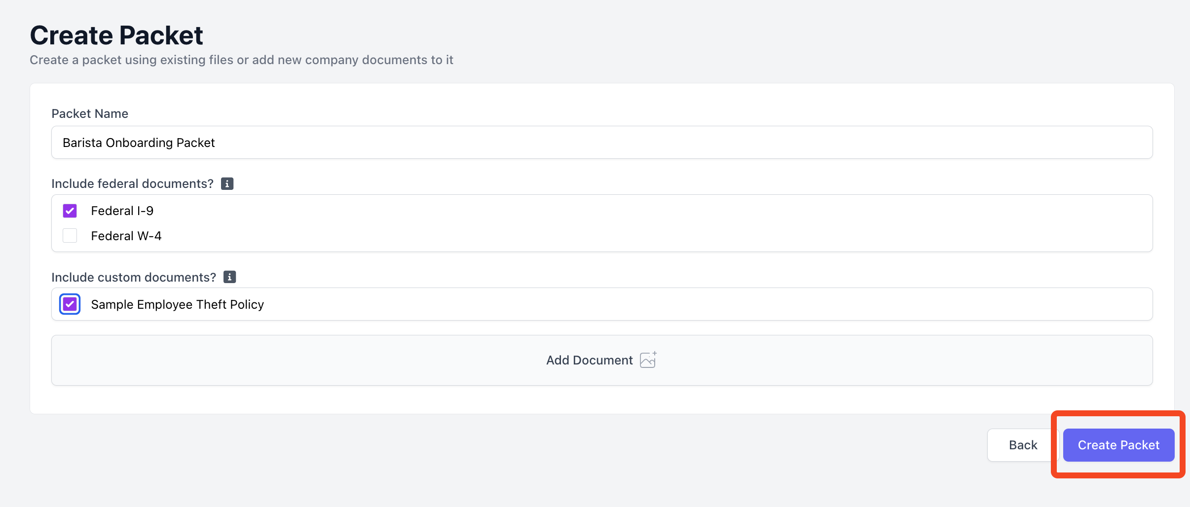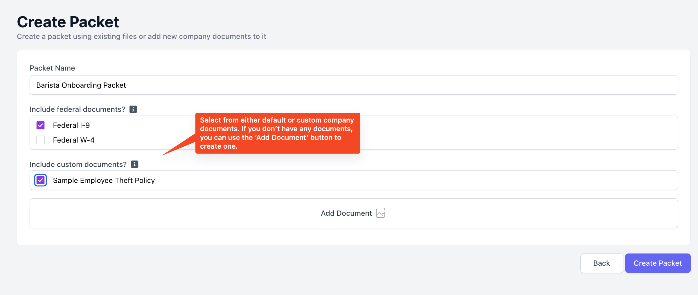 - Next, you’ll need to select what documents you’d like to include in your packet. Some default documents exist for you to include, including a federal I-9 form and a federal W-4 form.