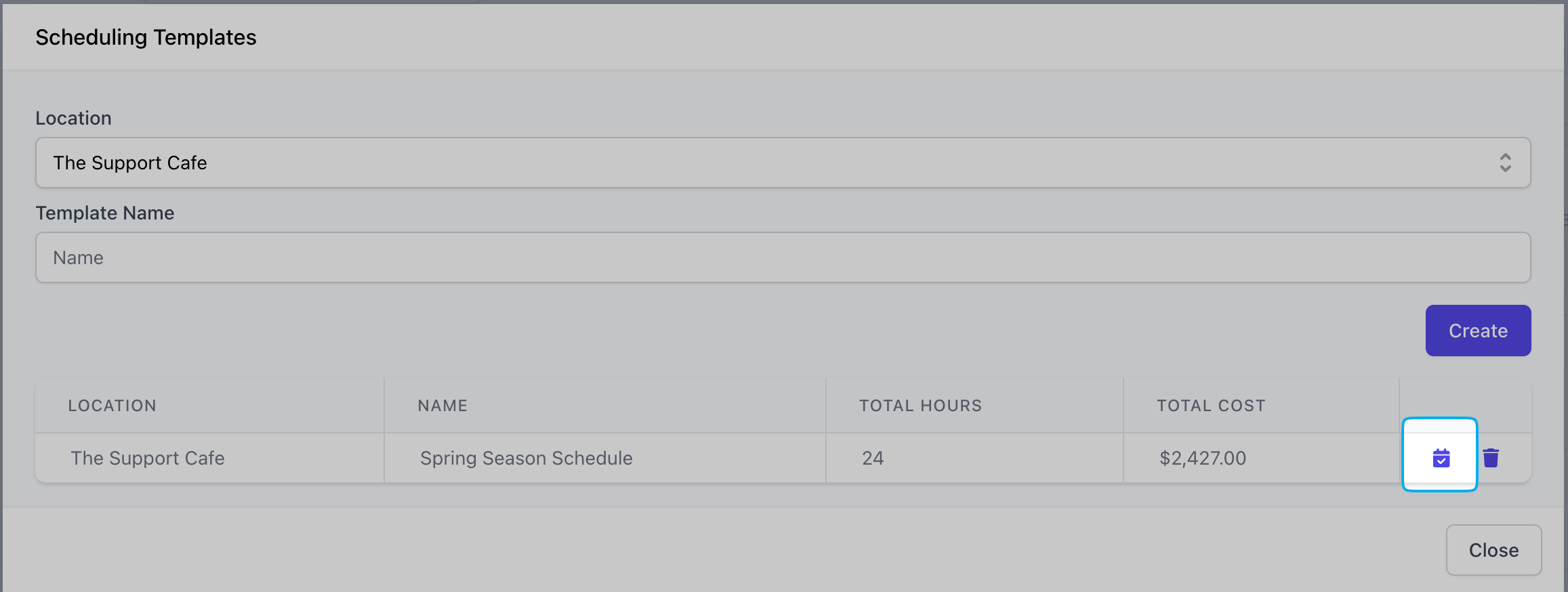 Creates the displayed schedule as a template to apply to future weeks when needed.Click the calendar icon to add the shifts attached to the template to the current week displayed