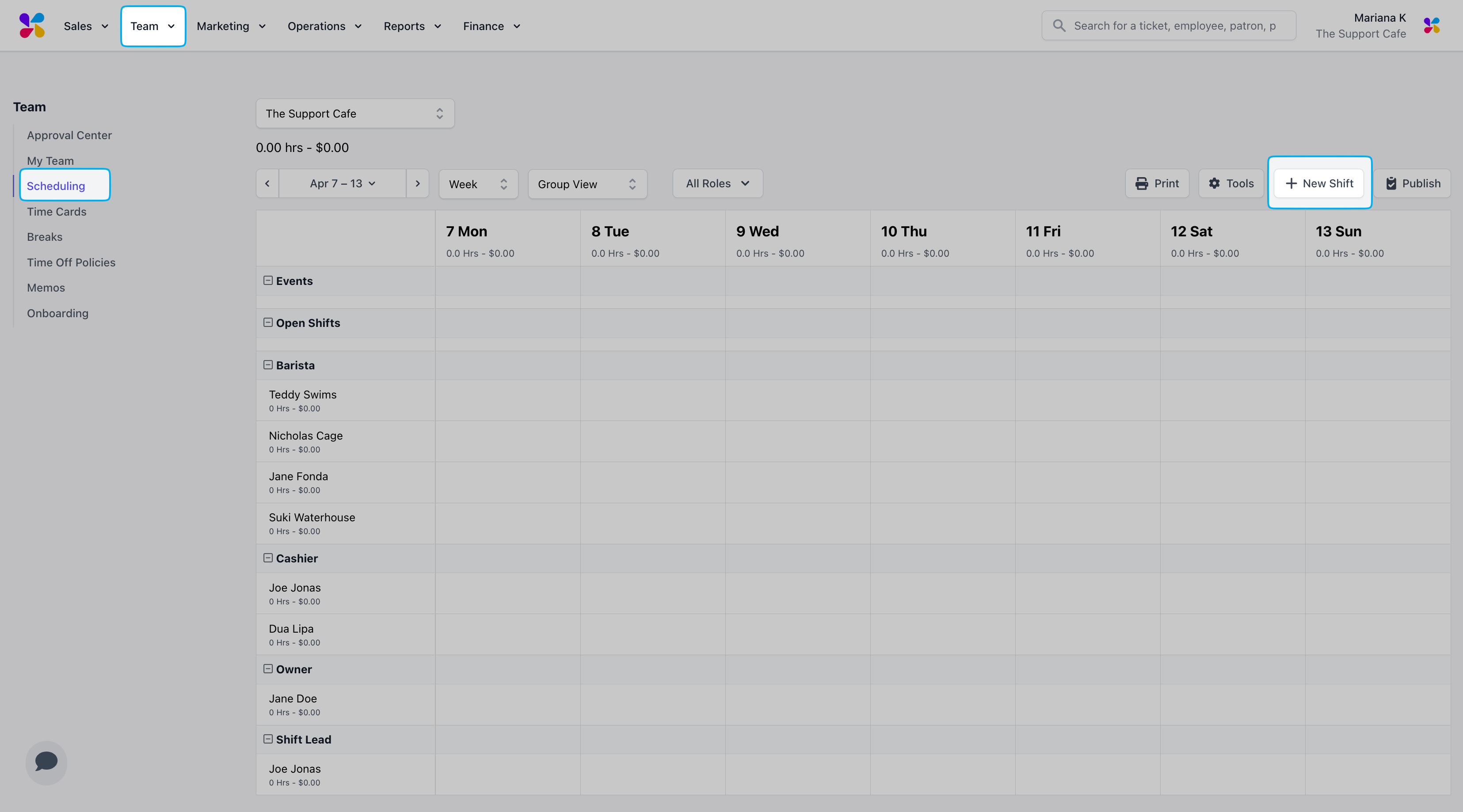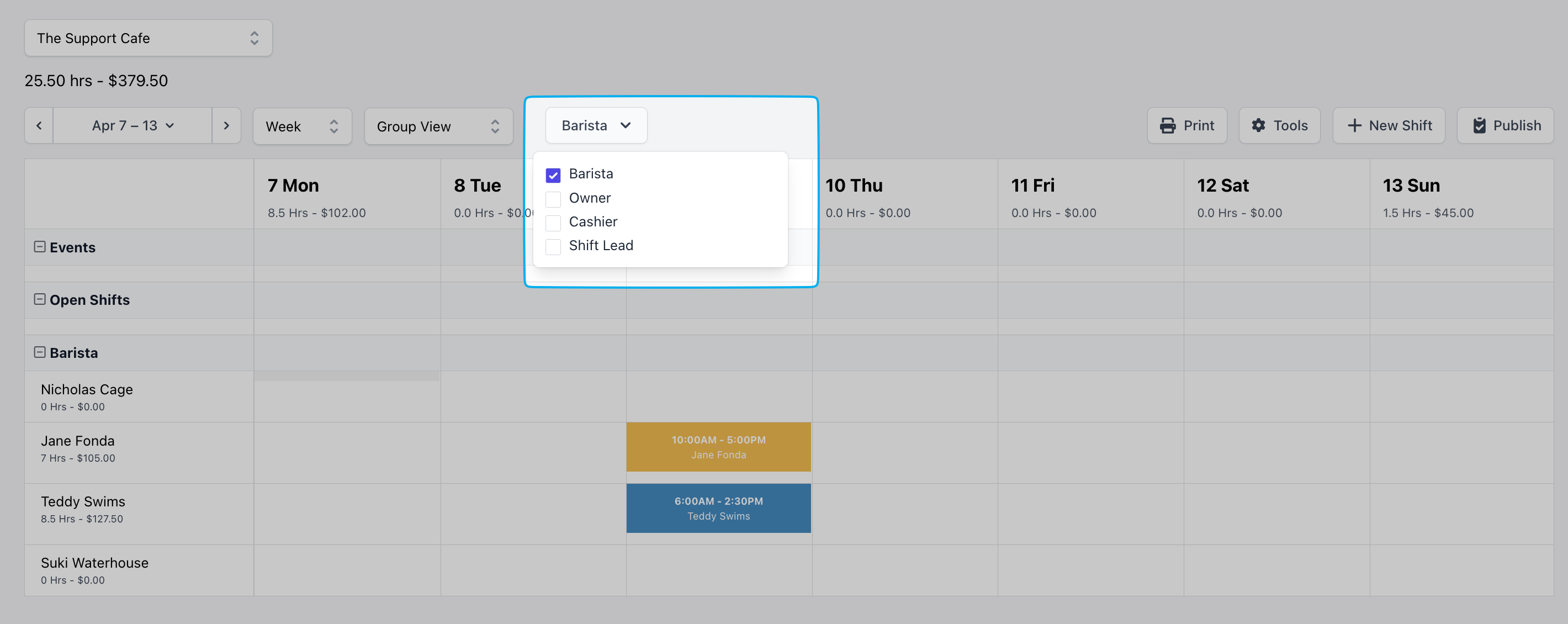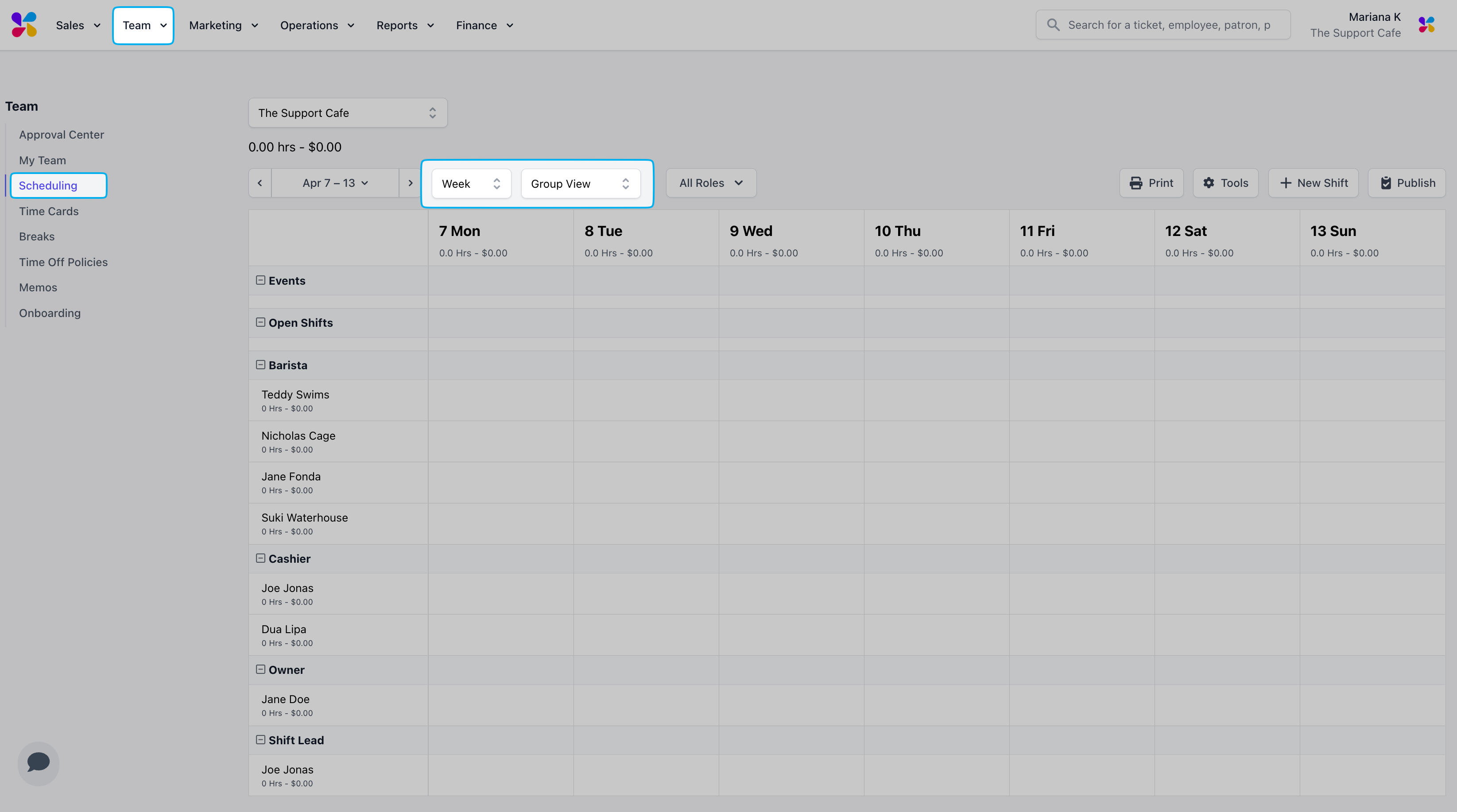 On the Web Dashboard, click Team > click Scheduling to view the current week with Group View The default view will display the current week and display all employees categorized by their role (Group View)