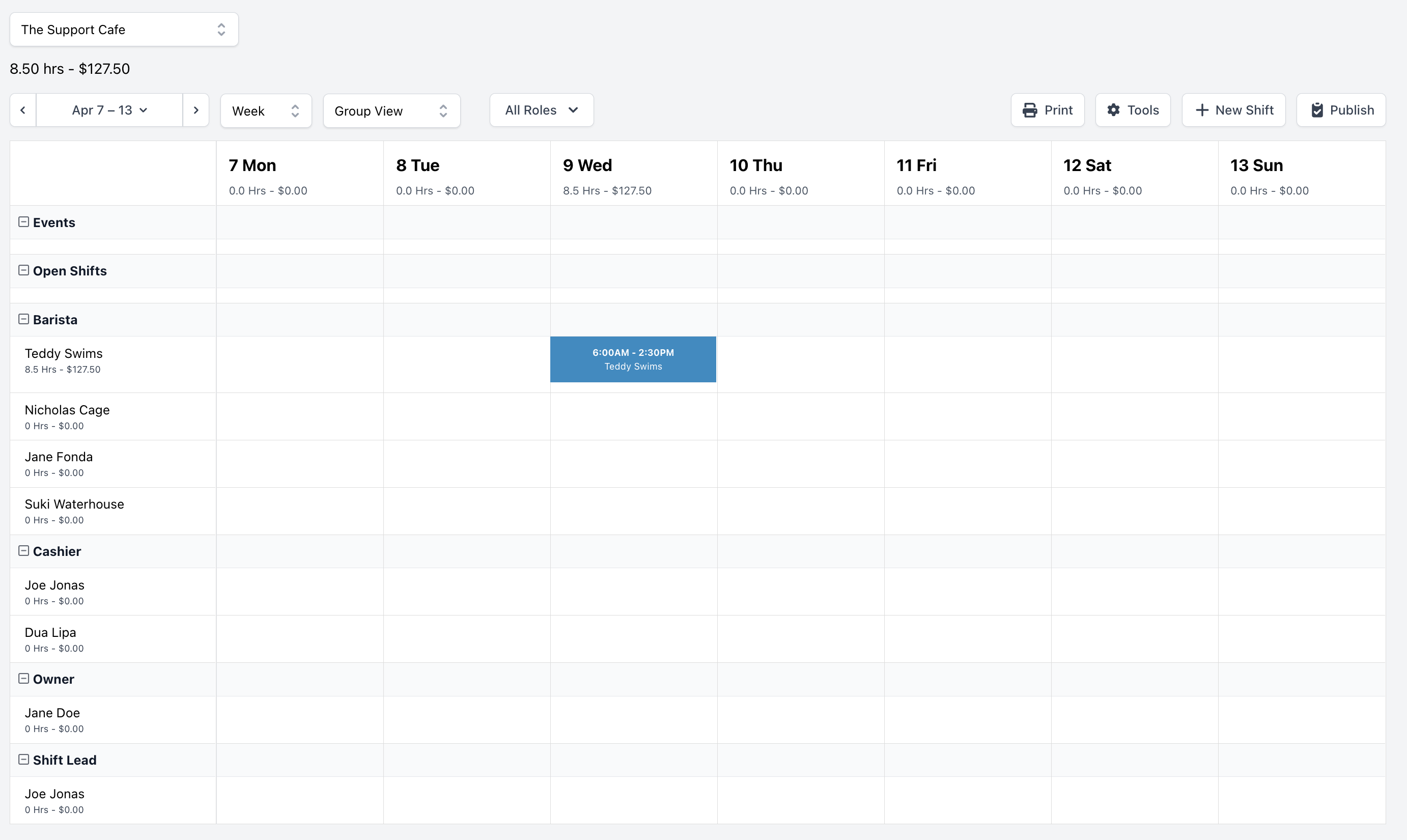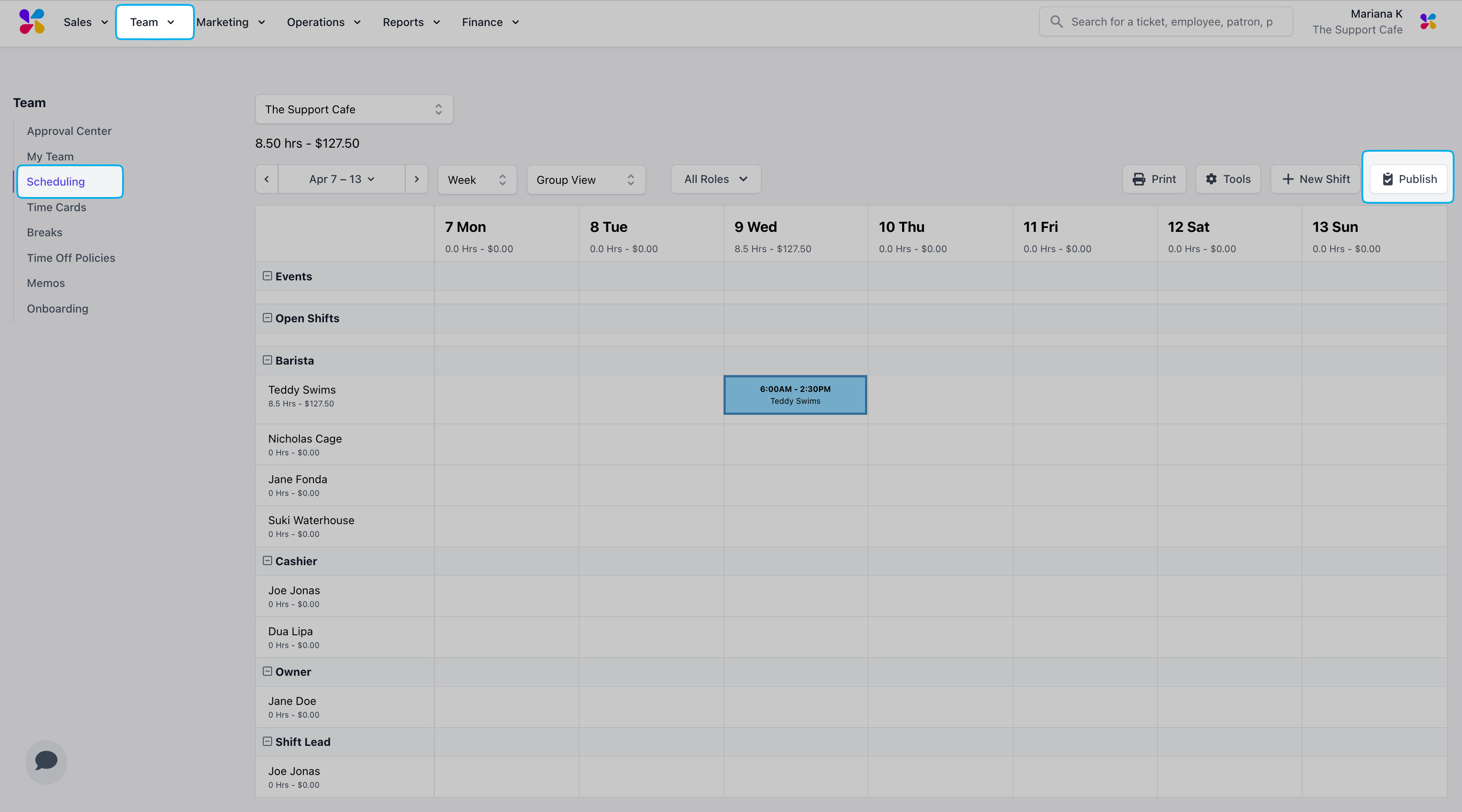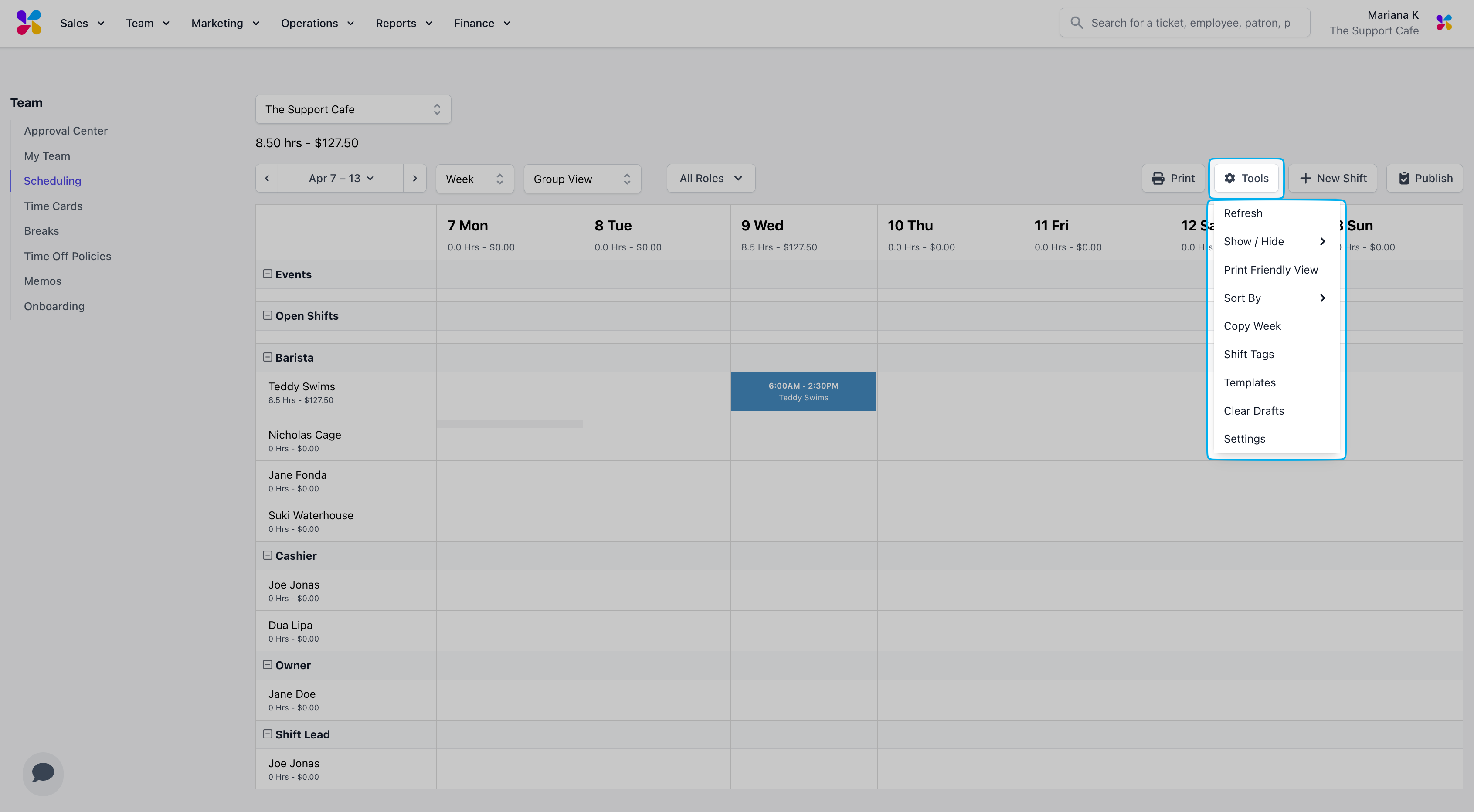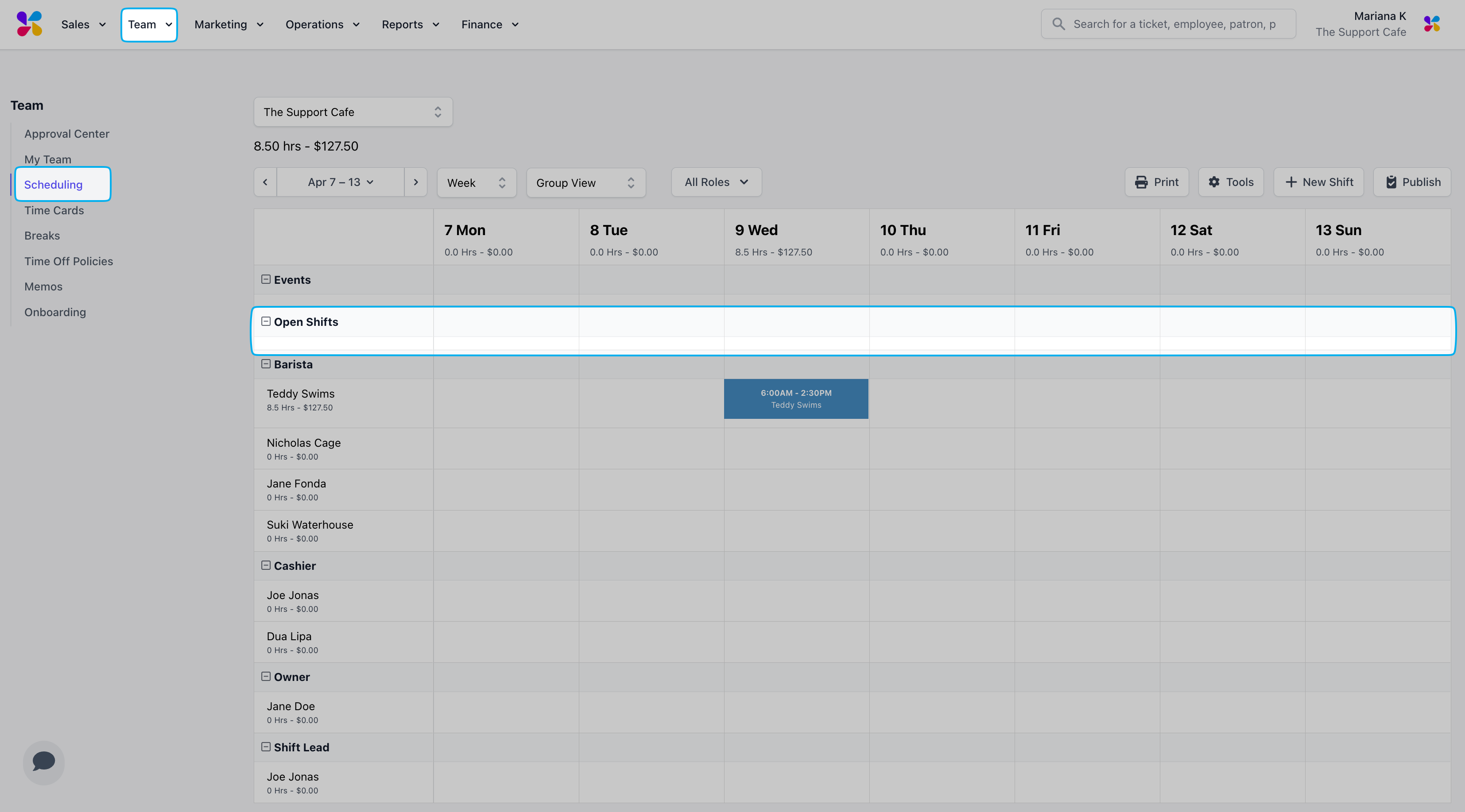 On the Web Dashboard, click Team > click Scheduling to view the current week with Group View The default view will display the current week and display all employees categorized by their role (Group View)