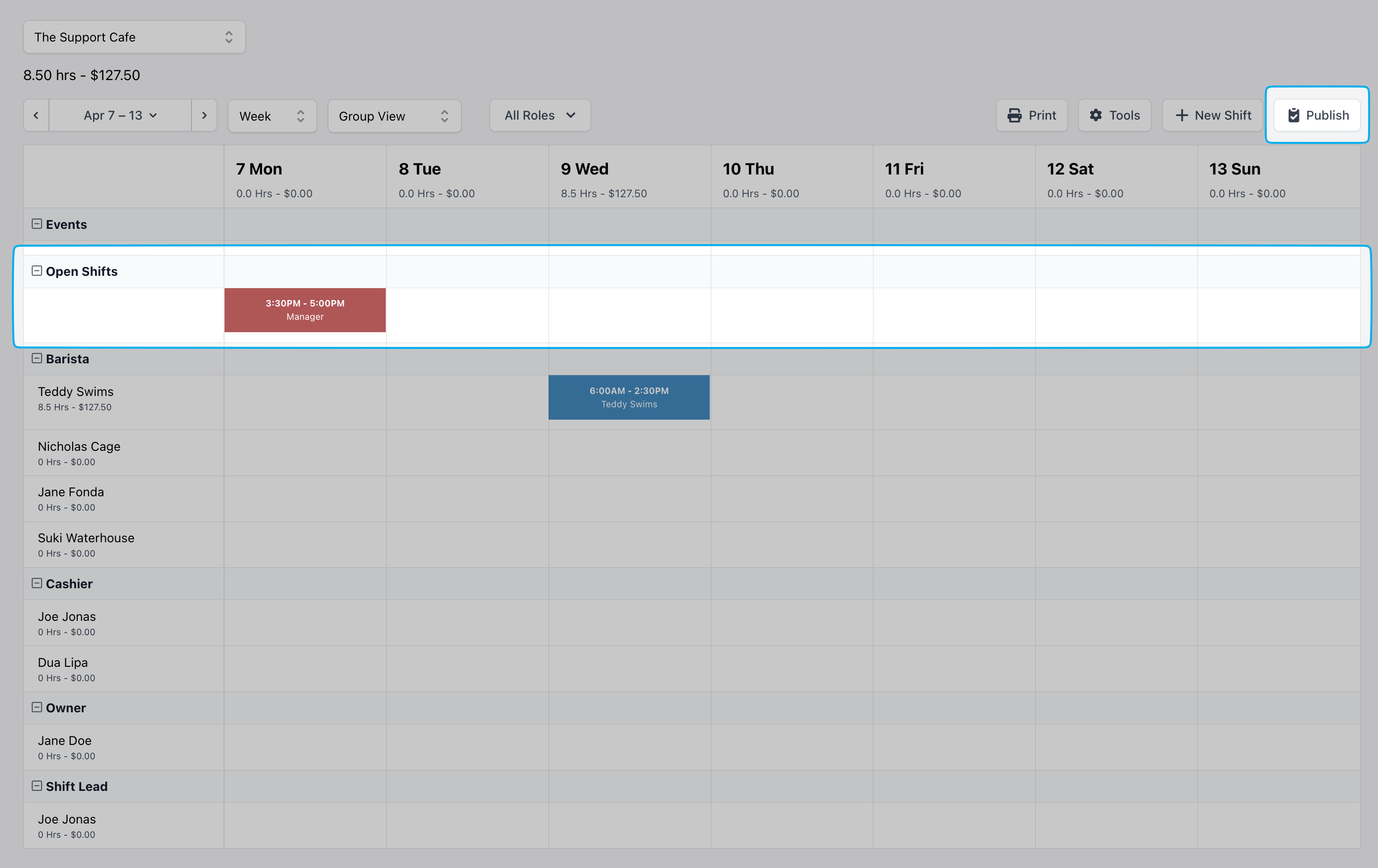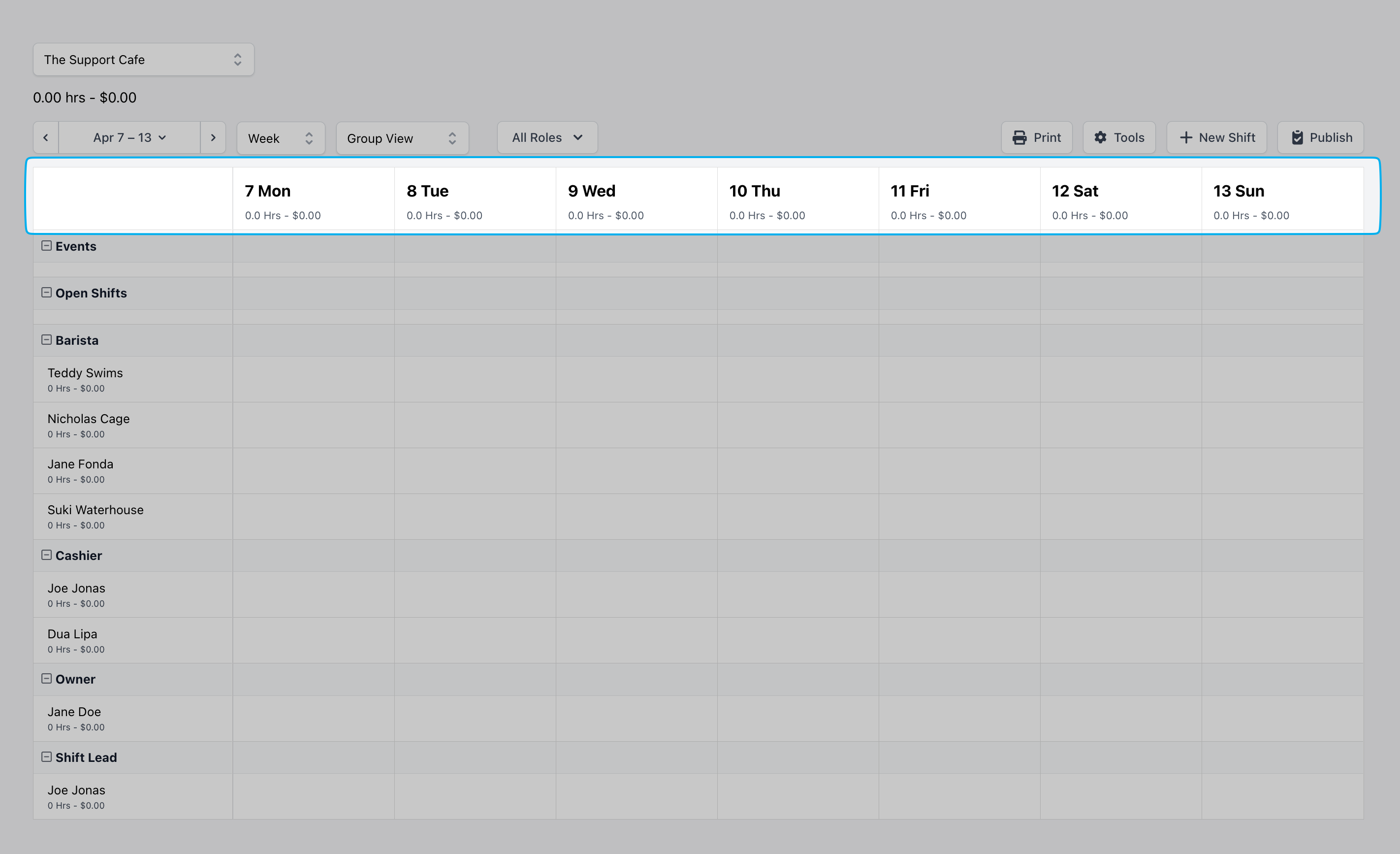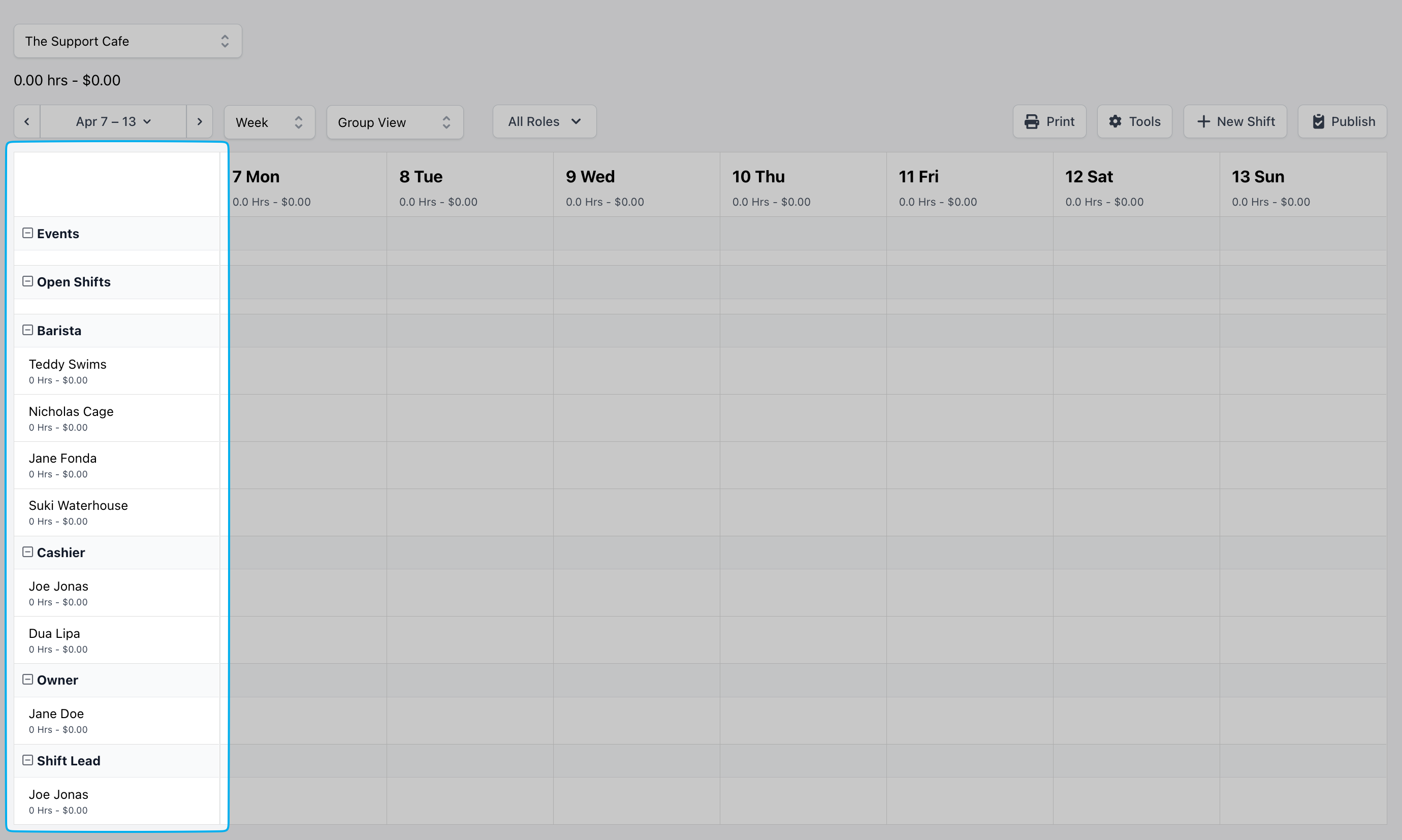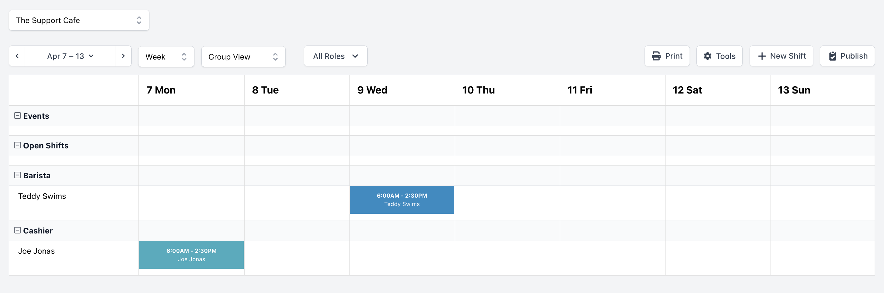 - Events and Open Shifts will appear above the list of Roles and Employees