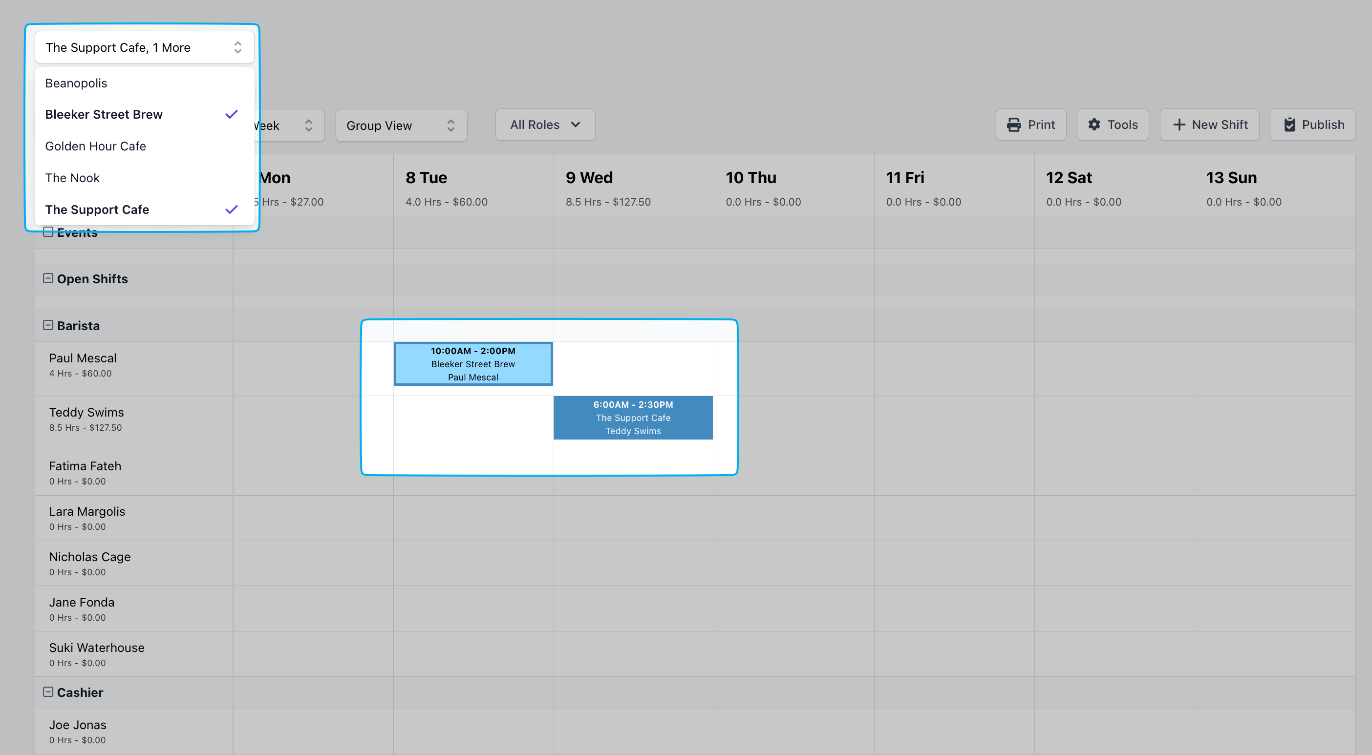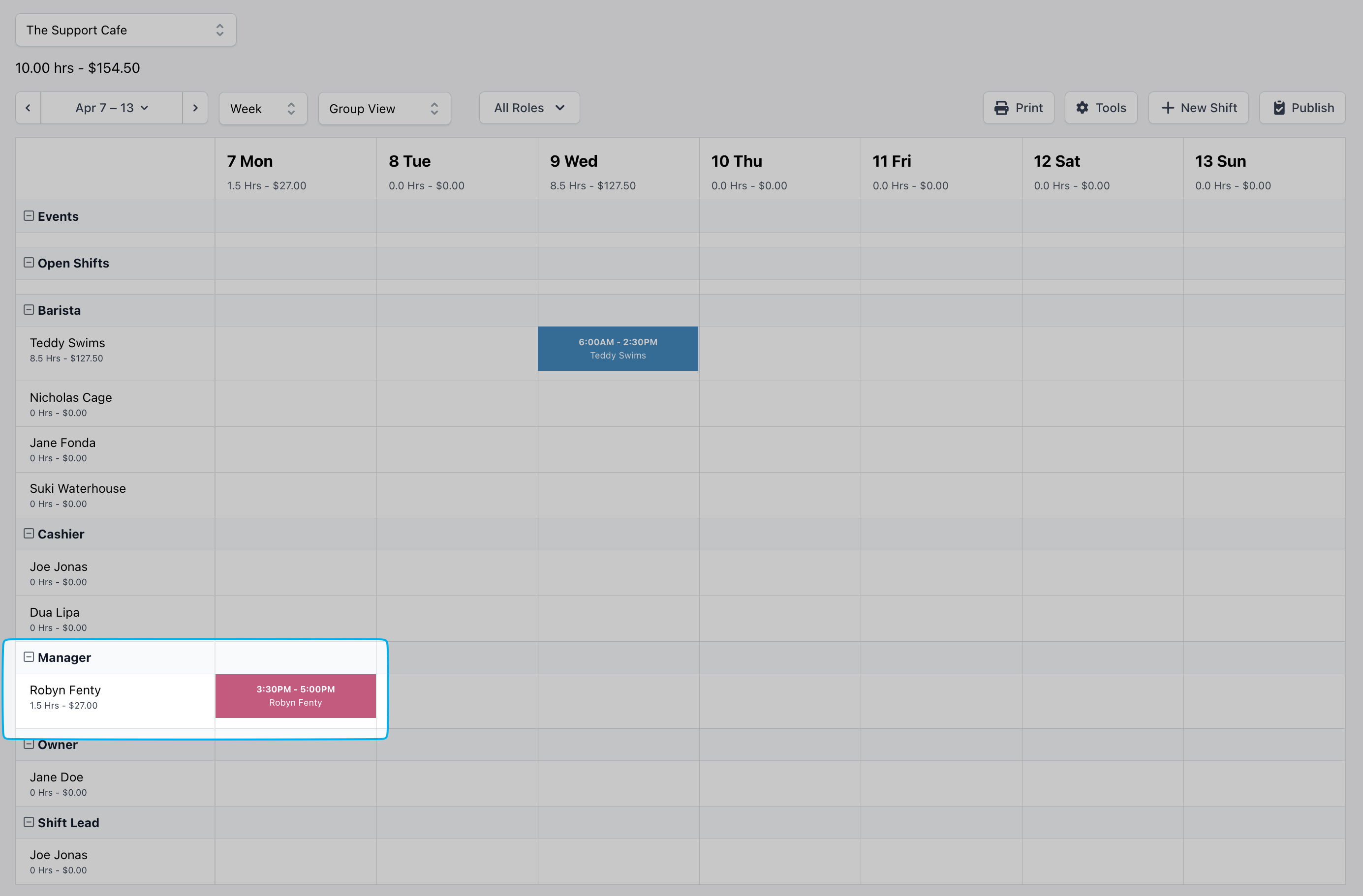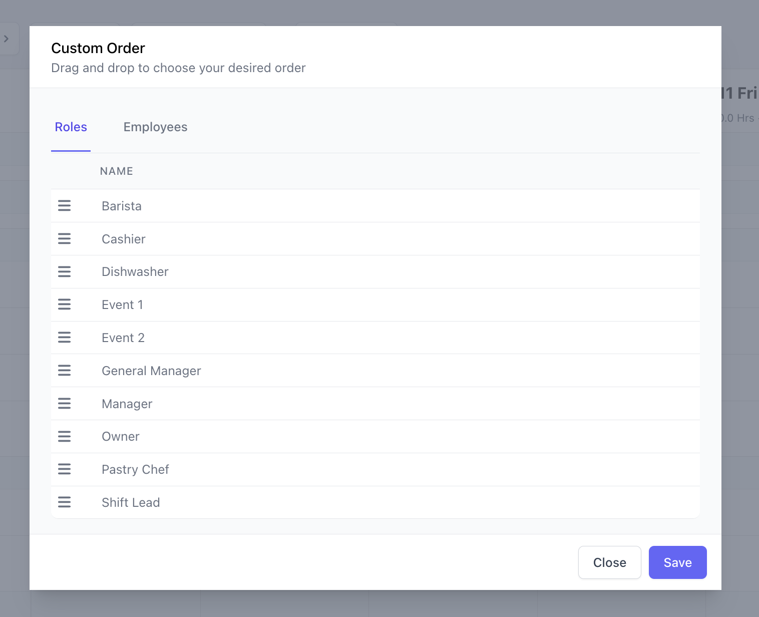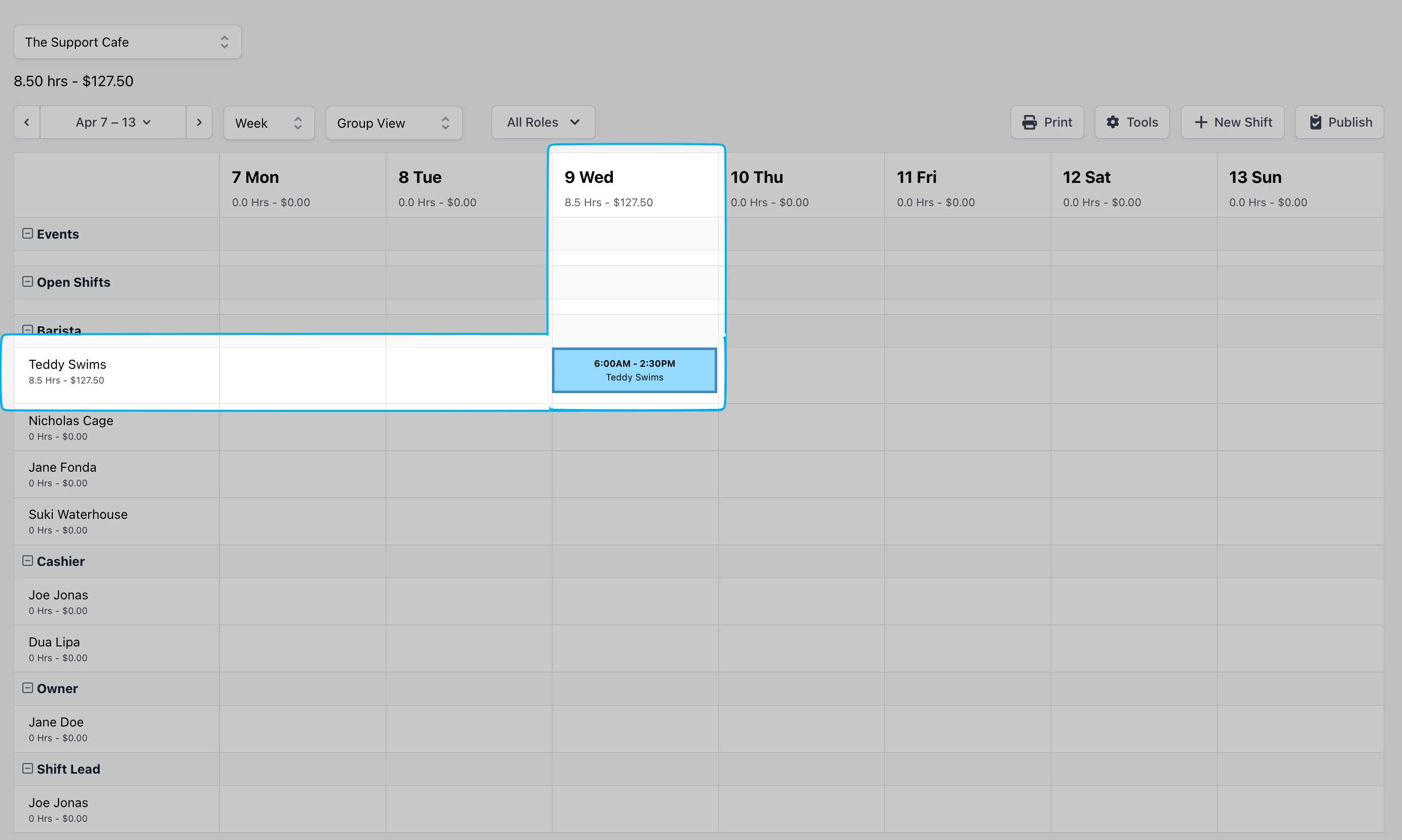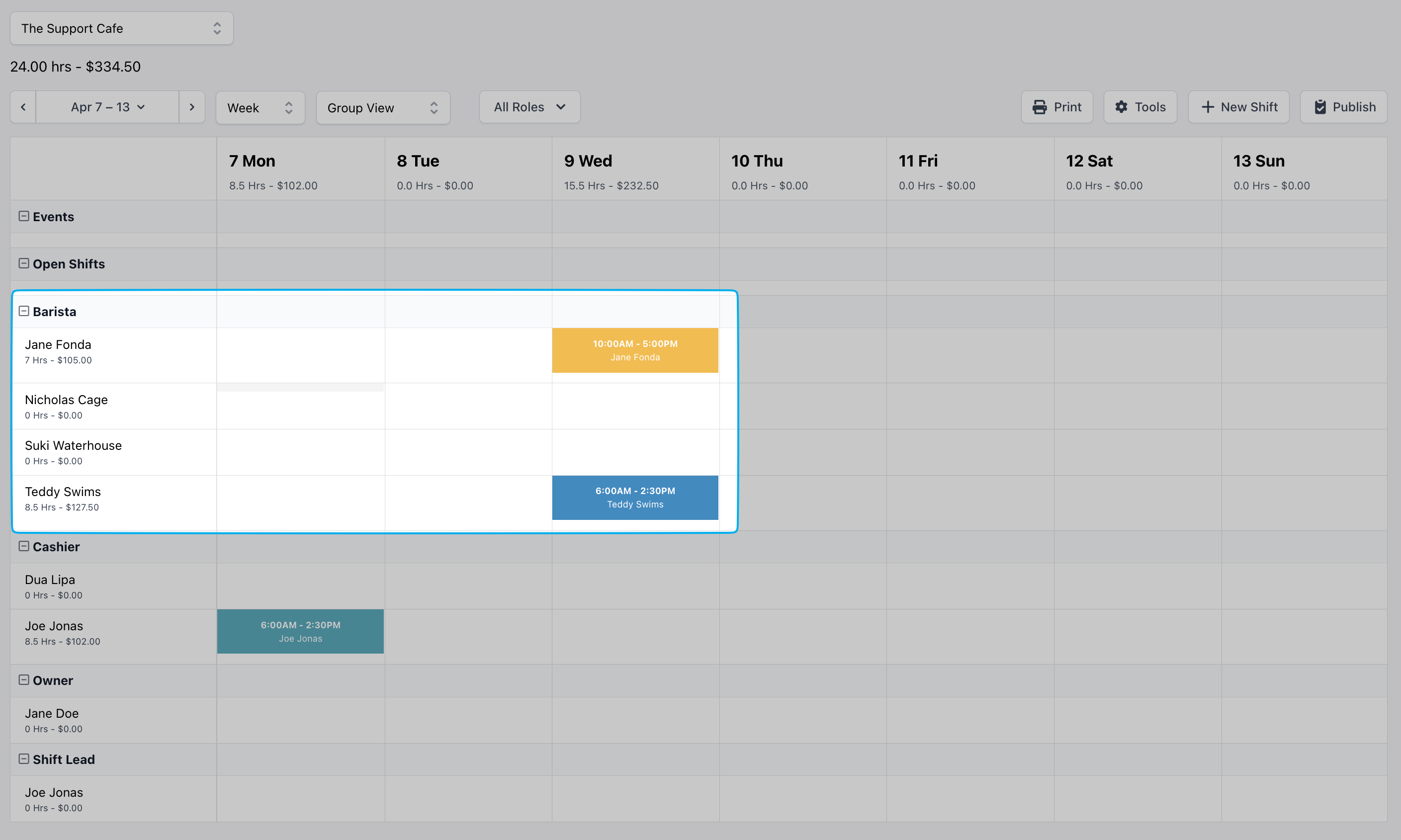 - Events and Open Shifts will appear above the list of Roles and Employees