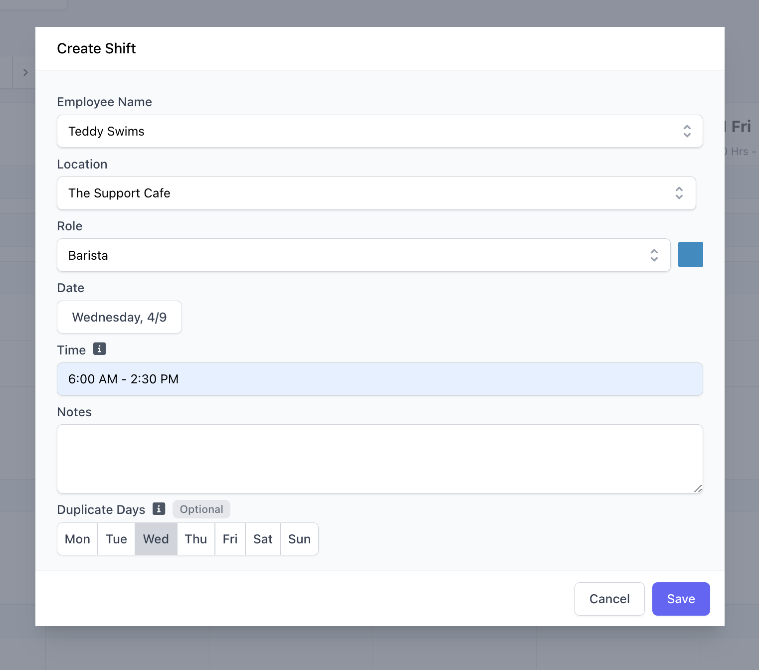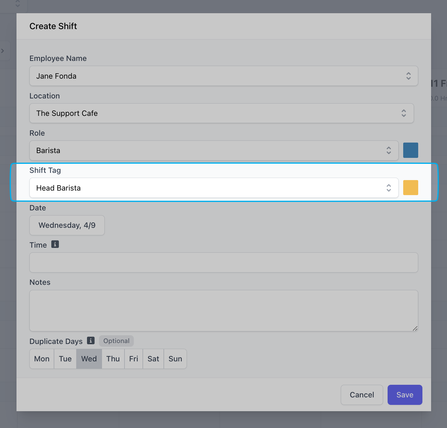 - Click the Time field to select or type the start and end time of the shift