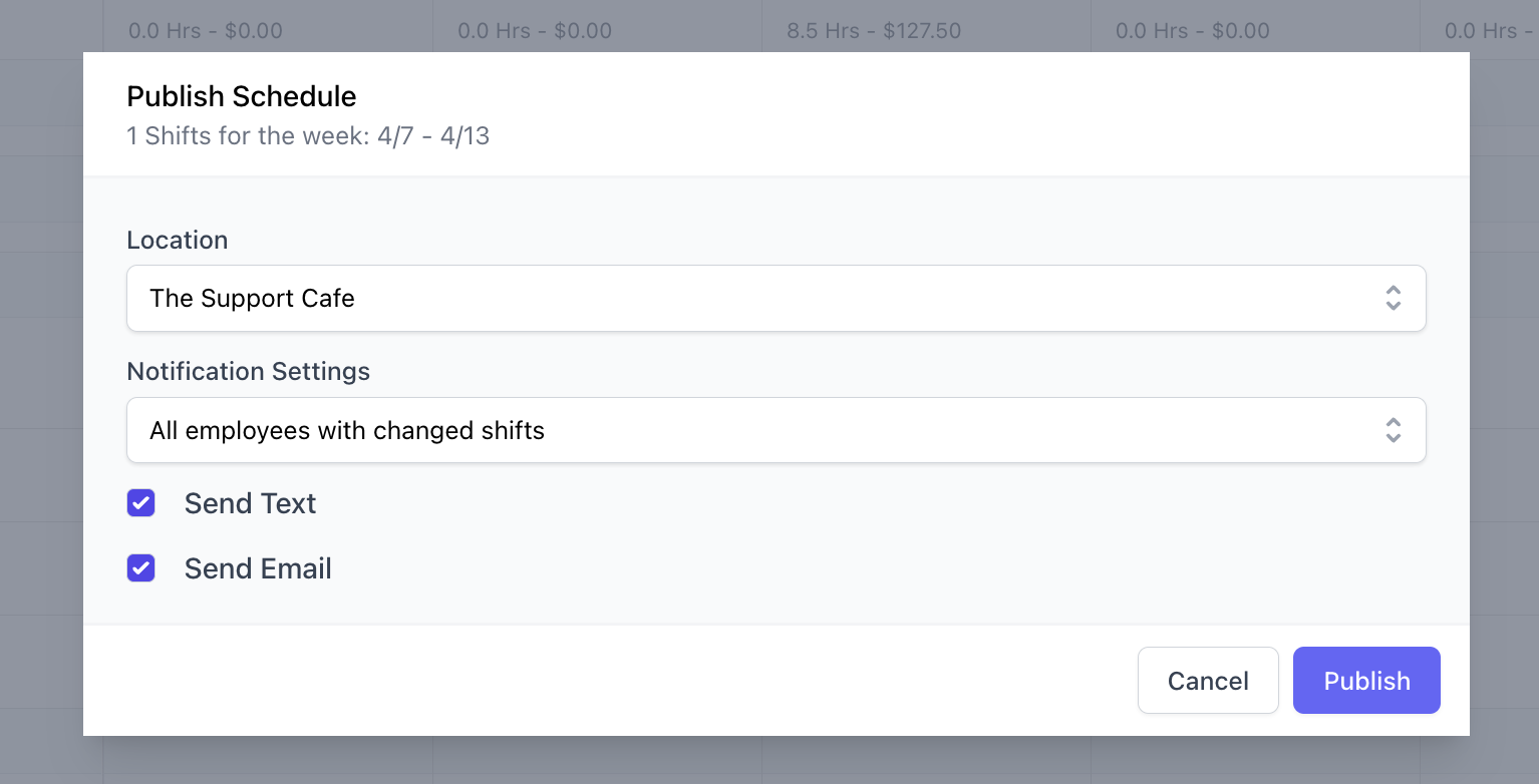 Click the pre-selected Send Text and Send Email checkboxes to select how the employees will receive the publish notification > click Publish