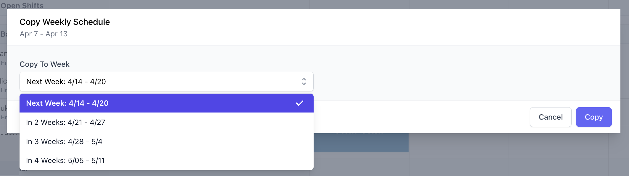Duplicates the displayed schedule’s shifts to the following week(s)