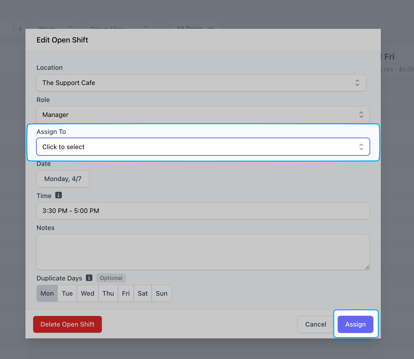- Click on the published open shift > click the Assign To dropdown to select an employee assigned to the open shift’s role > click Assign