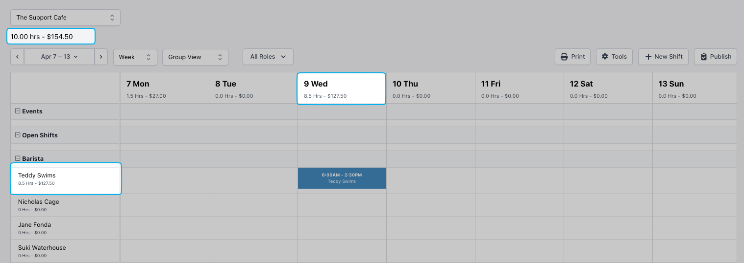 - The number of hours scheduled and associated pay for the scheduled time will appear under an employee’s name