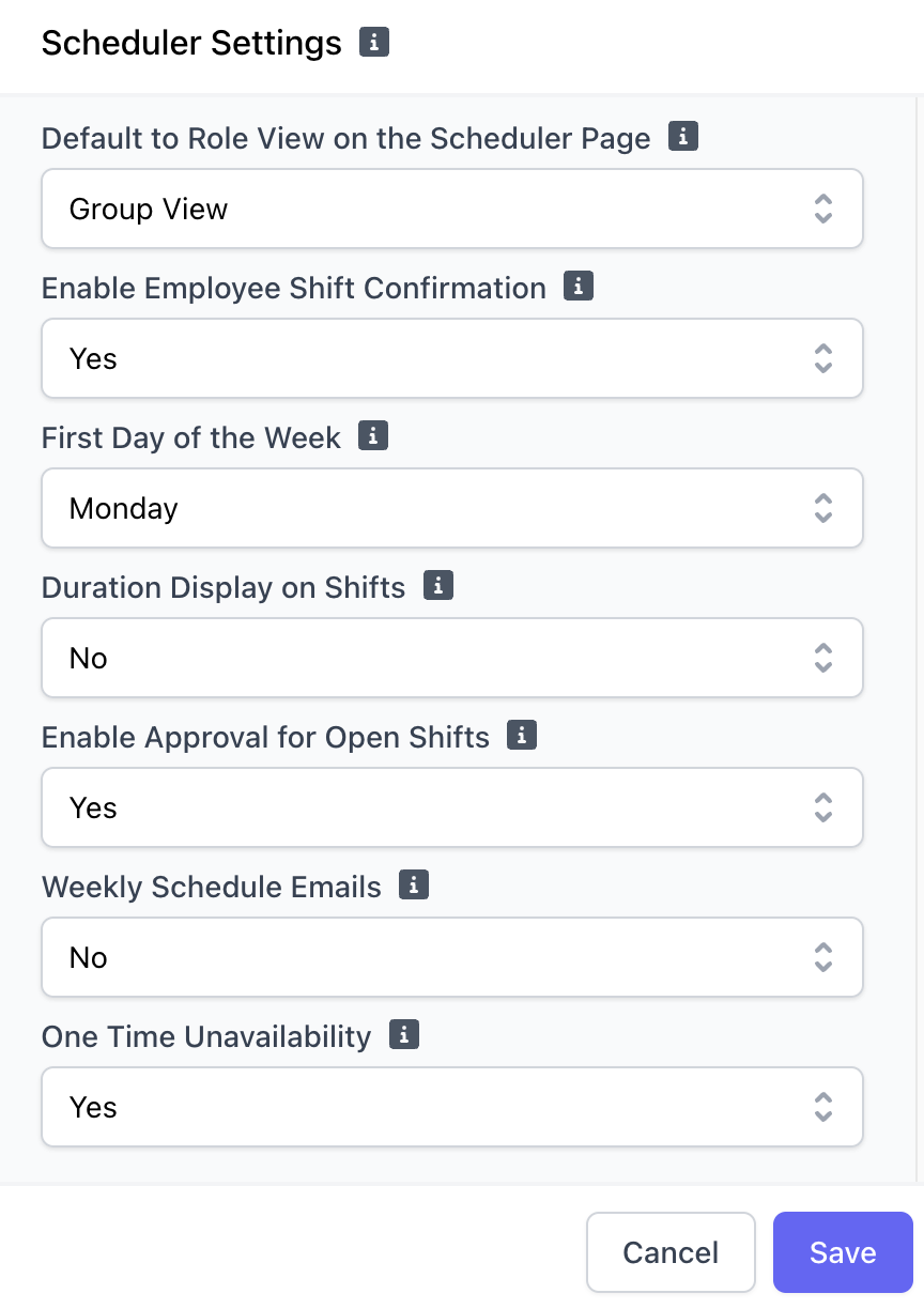 Weekly Schedule Emails: If enabled, employees will be sent a recurring weekly schedule email with upcoming shifts and open shifts