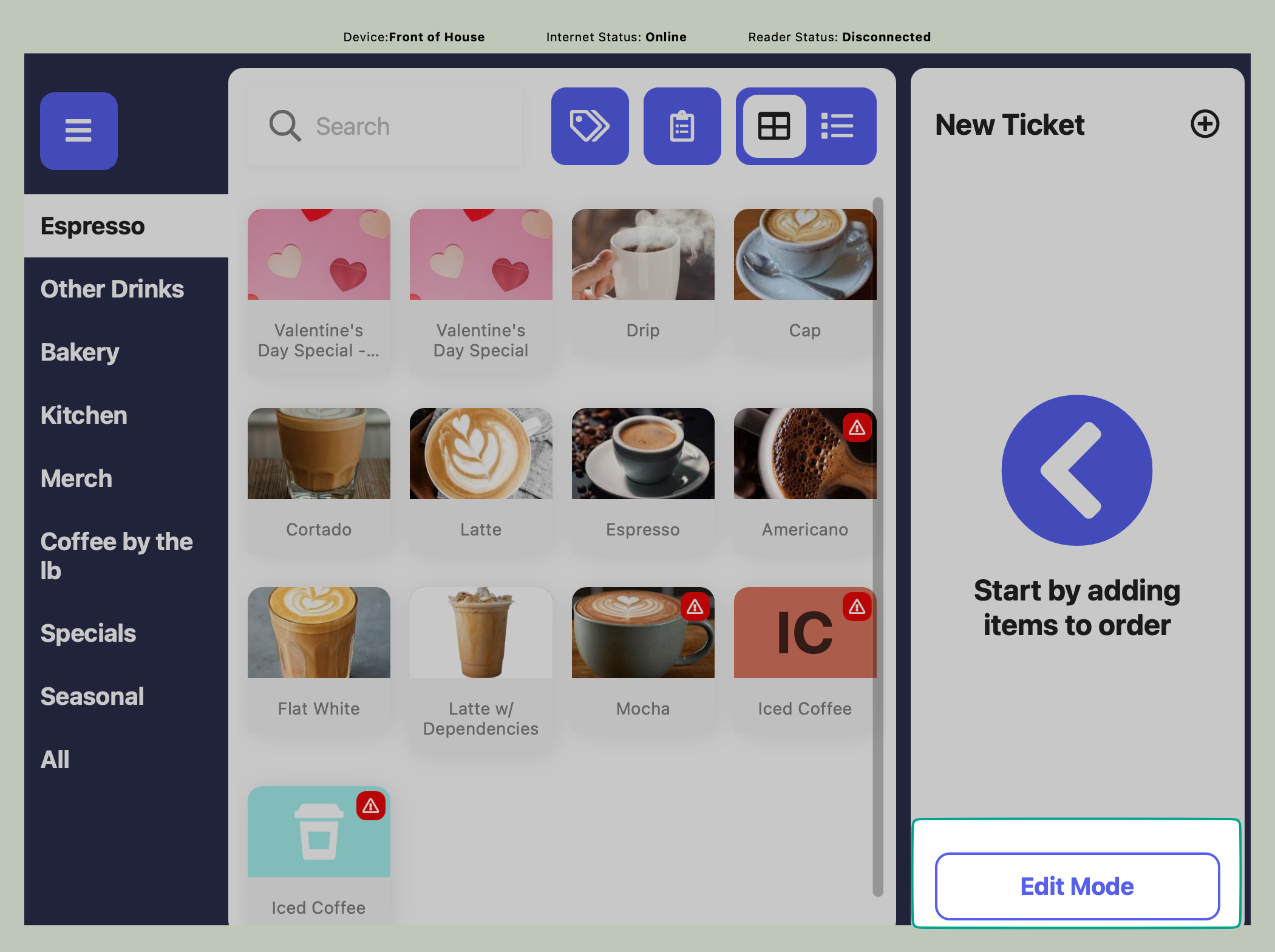 On the Point of Sale, press the tribar in the upper left screen corner > Settings button > Register Settings