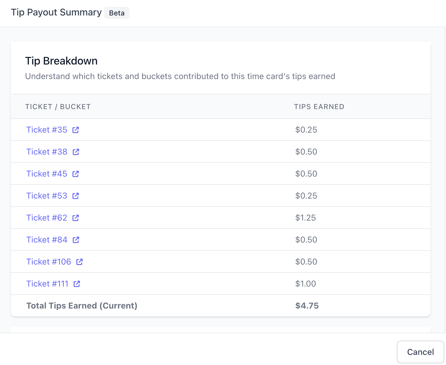 Edit a time card’s location, employee, role, and clock in & out times.View the tips earned on the time card by clicking View Tip Payout Breakdown