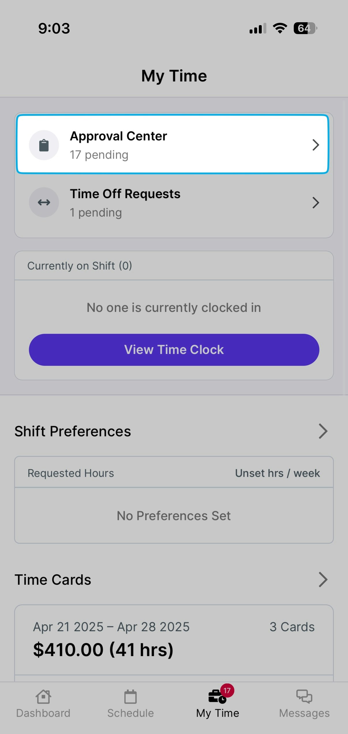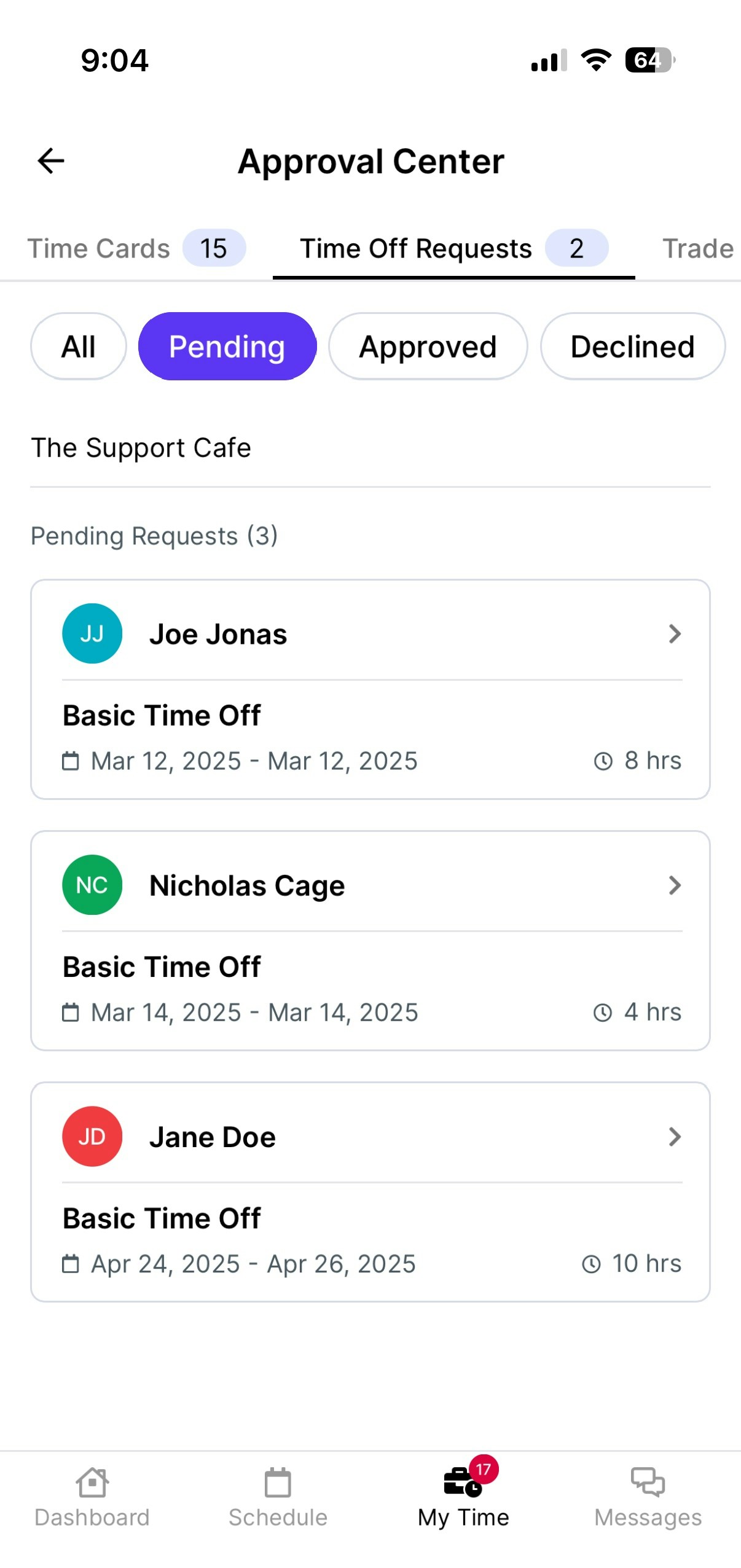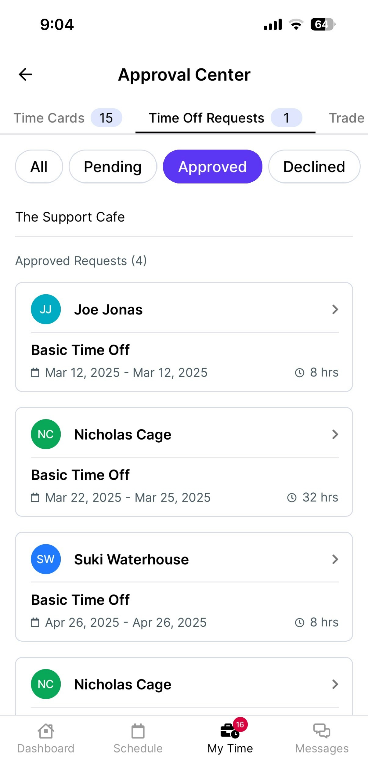 Managers can approve time off requests on the Dashboard and Hub App.Approve Time Off Requests from the Dashboard