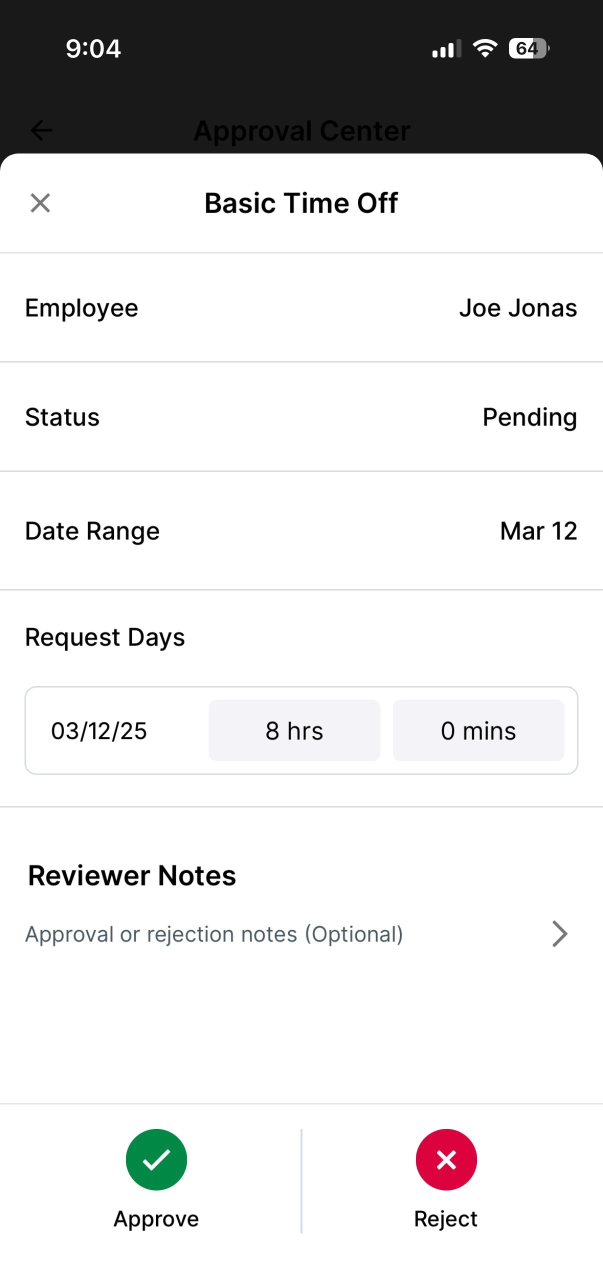 Navigate to the Time Off Requests tab and use the ✓ to approve or X to reject requests. To include a note alongside the approval or rejection, use the View Details button.