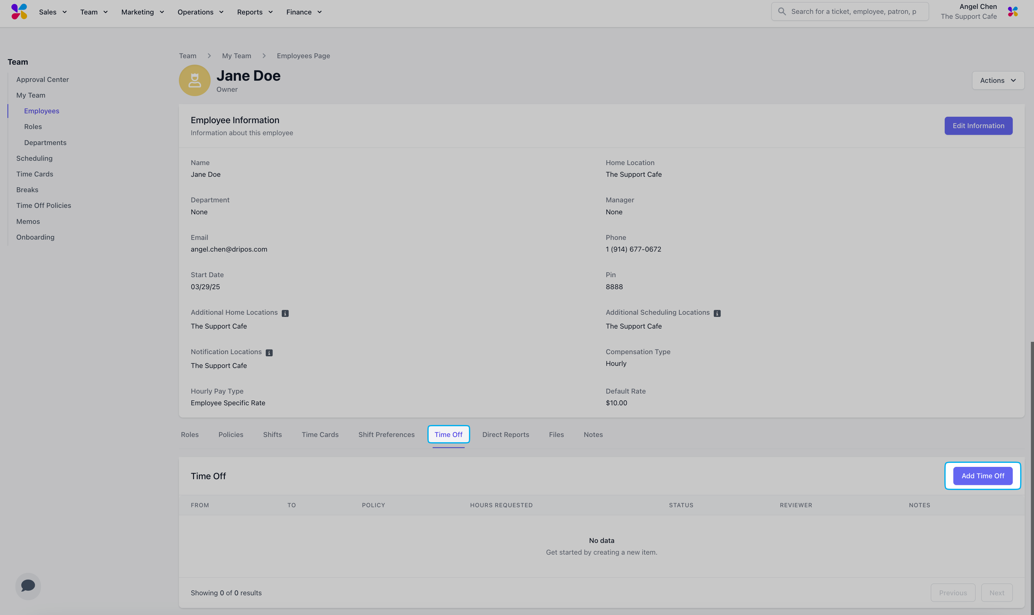 Navigate to the Time Off tab in the employee page and select the Add Time Off button