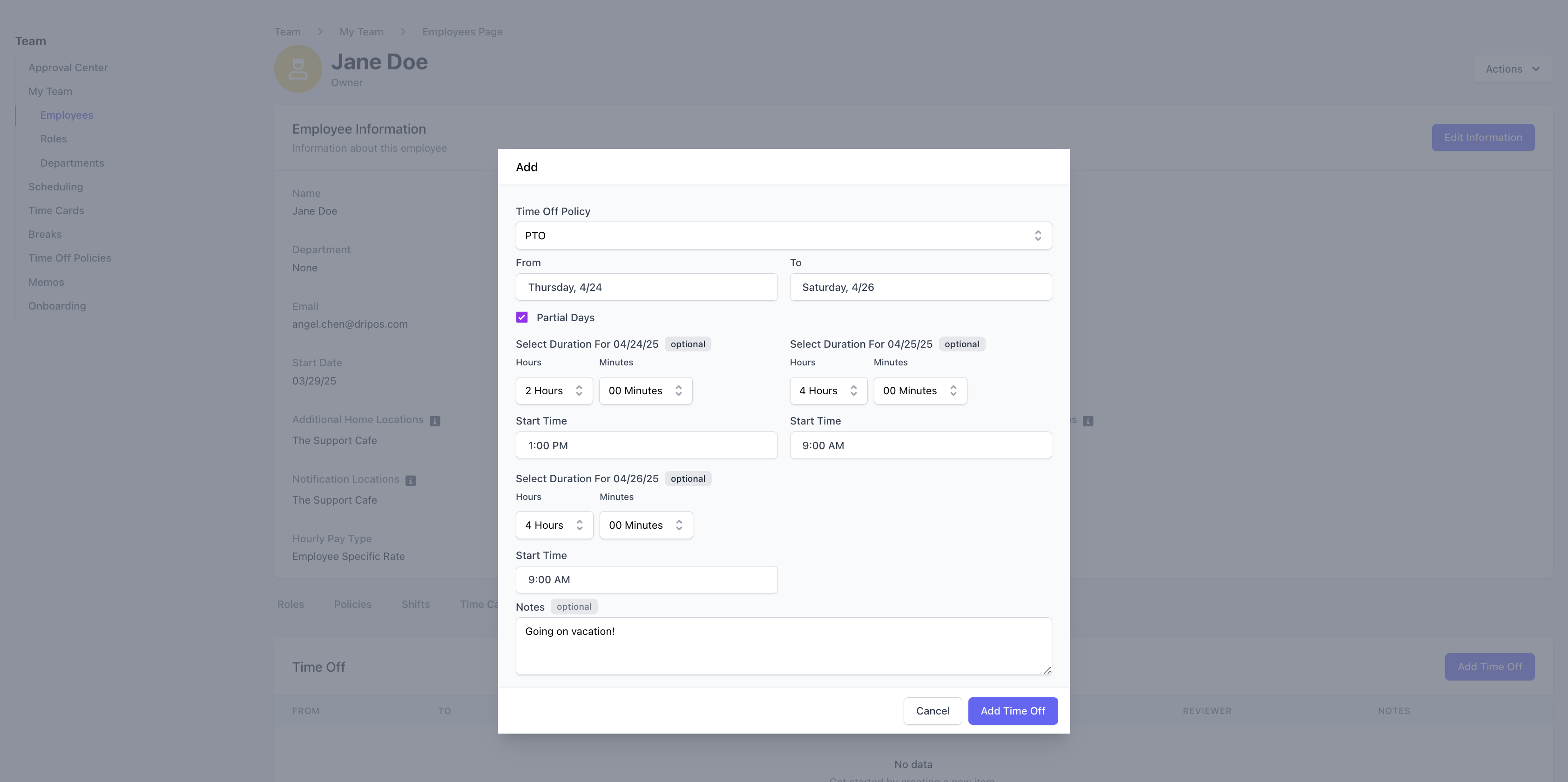 Input the time off request details in the pop-up and click Add Time Off when finished