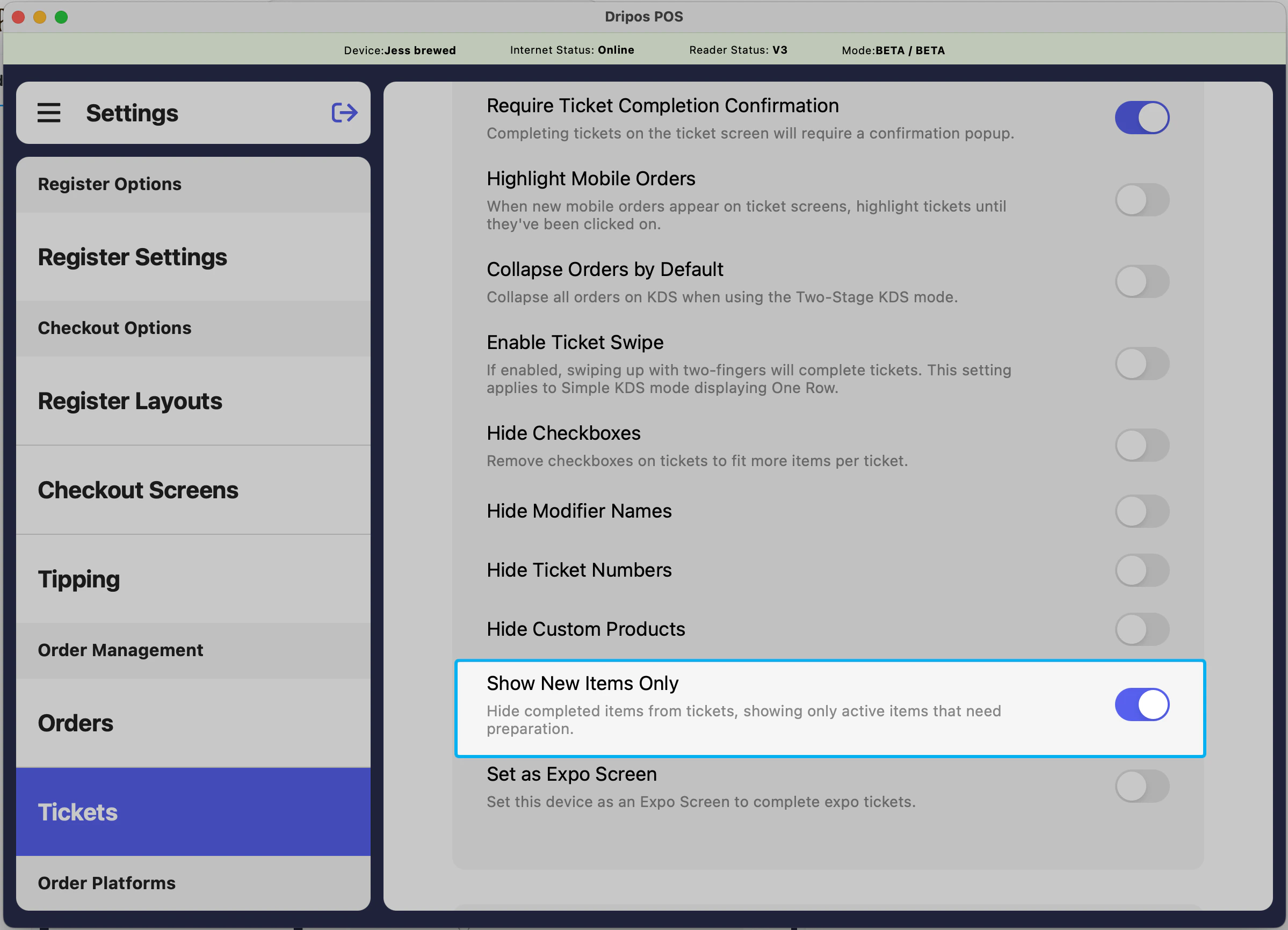 When this setting is enabled, any item within a ticket that has been marked as complete will be hidden from the KDS ticket view.On the POS, navigate to Settings > Tickets and scroll down to the bottom to turn on Show New Items Only.