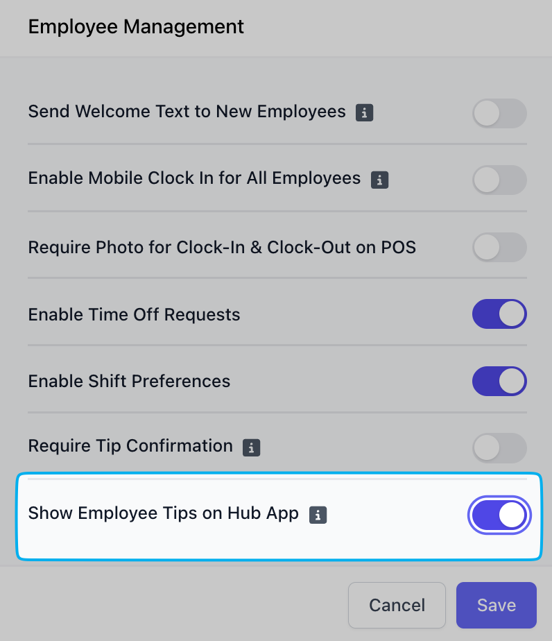 - Payroll customers that split tips by Transaction now have the ability to show Employee Tips on Hub App. Enable this setting on the Dashboard under Settings > Employee Management > Show Employee Tips on Hub App = Enabled.