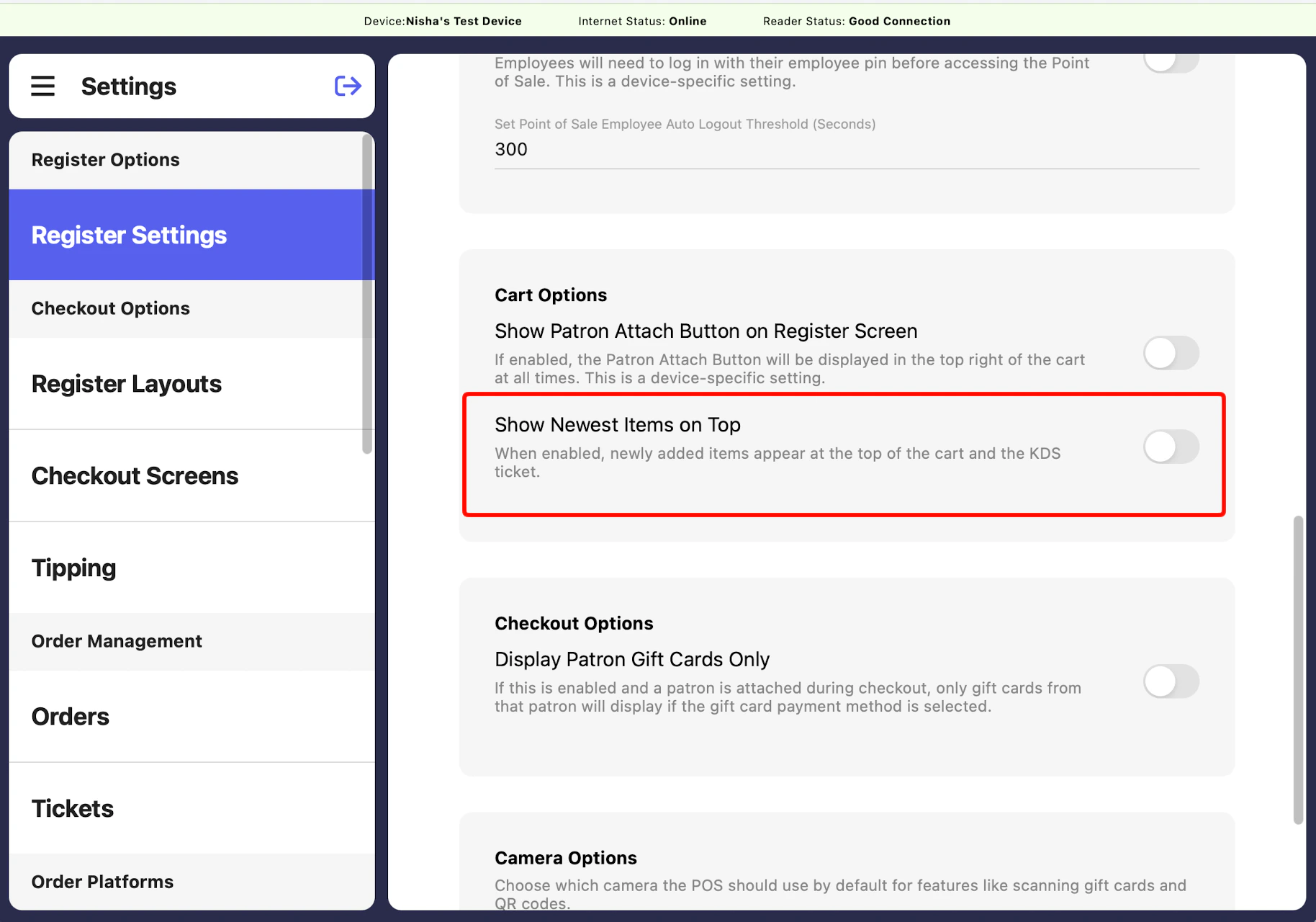 We have added a setting that will enable items added to the cart on the POS and KDS to display in reverse chronological order, with the most recently added item appearing at the top. This update ensures staff can quickly identify new items during order building and fulfillment across both the POS cart view and KDS.